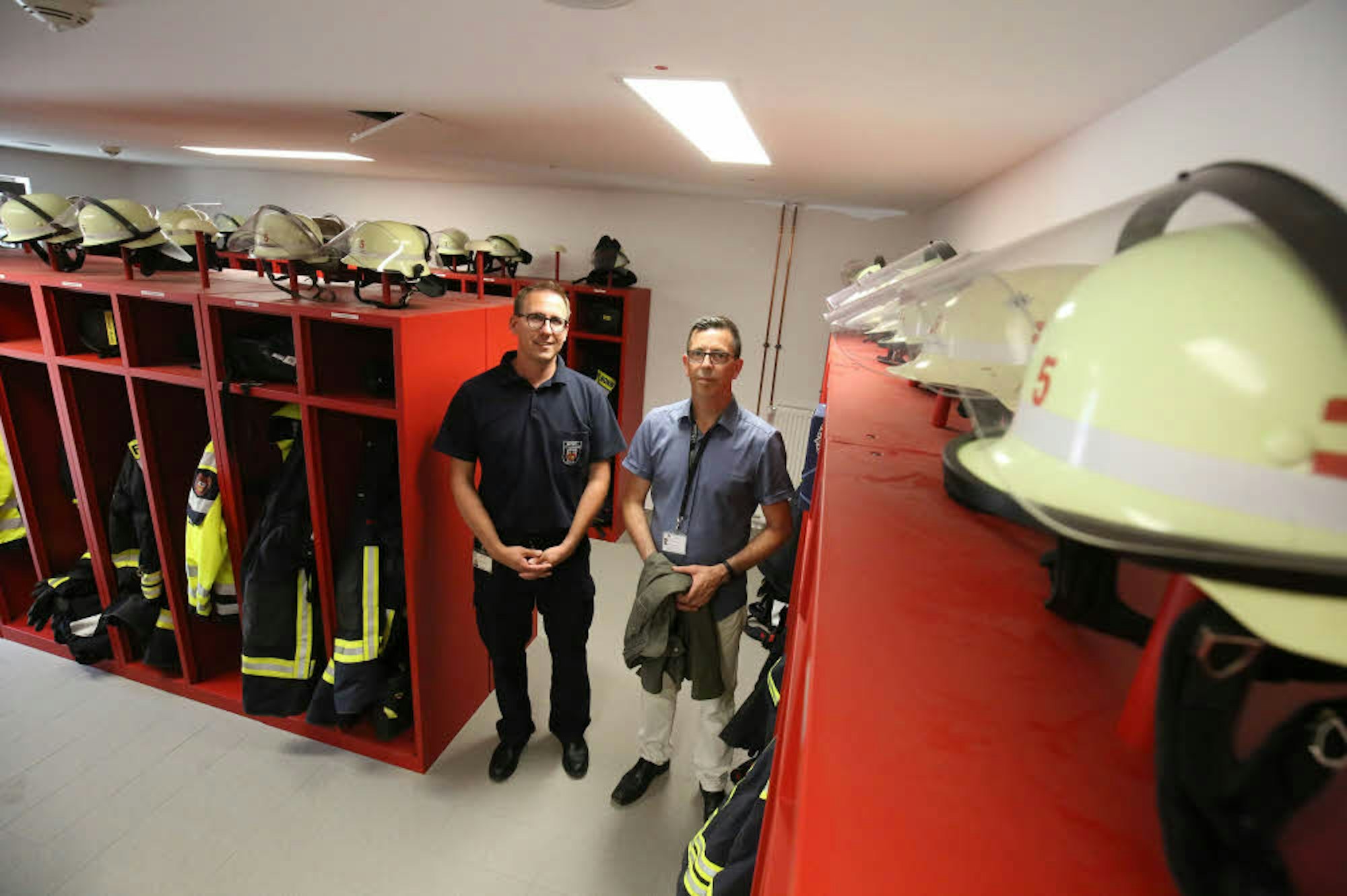 In der Kleiderkammer findet jeder, auch Wachleiter Martin Haselbauer (l., hier mit dem am UKB für Brandschutz zuständigen Kurt Zimmermann) seine Ausrüstung.