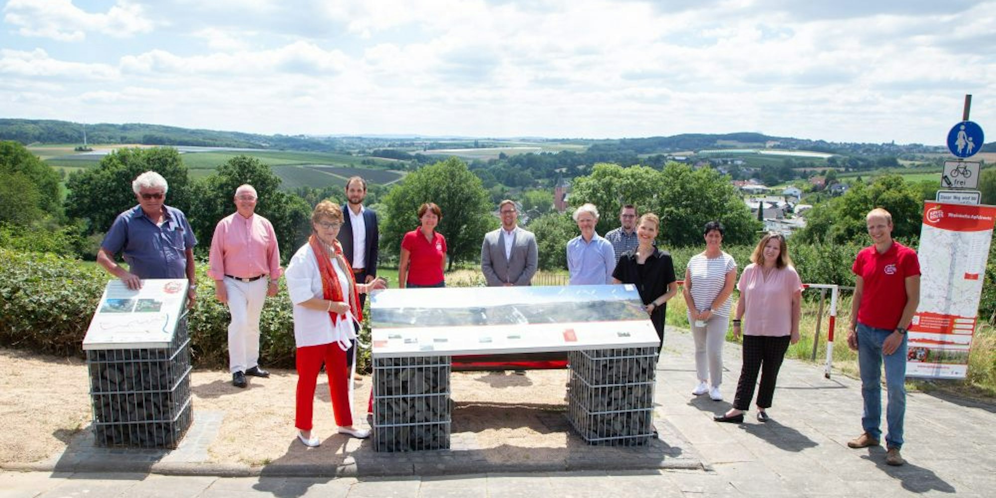 Wachtberg – Der Erlebnispunkt „Kulturlandschaft“ am Rheinhöhenfriedhof zwischen Ließem und Oberbachem wurde offiziell eröffnet. Eine Liegebank und eine Panoramatafel laden Gäste und Einheimische ein, zu verweilen und die einmalige Kulturlandschaft Wachtbergs zu erleben. Der durch die Kreissparkassenstiftung für den Rhein-Sieg-Kreis mit 8000 Euro geförderte Infopunkt wurde gemeinsam durch die Gemeinde Wachtberg und den Rhein-Voreifel Touristik entwickelt und umgesetzt.