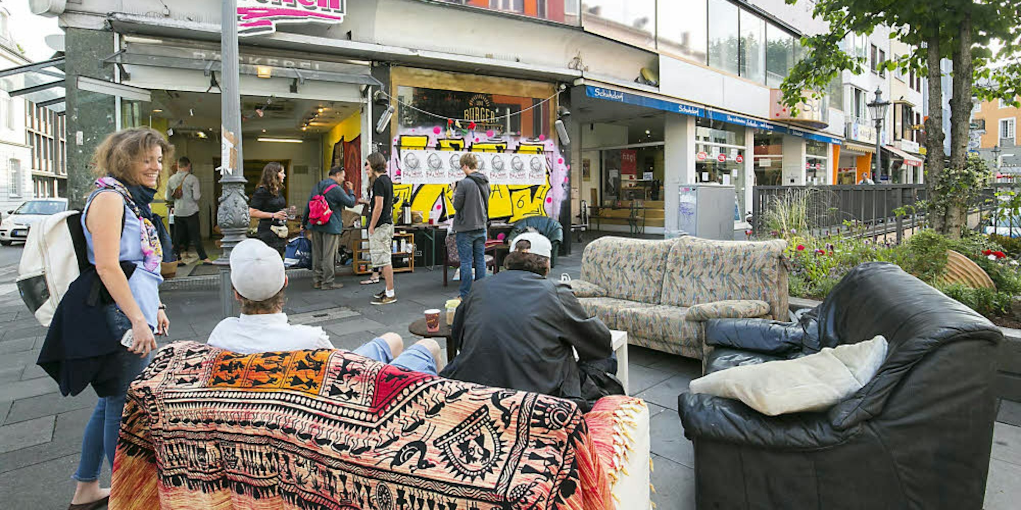 Teppiche lagen auf dem Boden, hingen an den Wänden, ein kleines Buffet für das Protestfrühstück war aufgebaut worden. Auch auf dem Bürgersteig standen Stühle, Tischchen und Polstermöbel. Auf die andere Straßenseite oberhalb der Marktgarageneinfahrt waren drei Sofas hingestellt worden, die schon mal bessere Tage gesehen hatten, davor ebenfalls Tischchen. Das „Café Viktoria“ sah eher aus wie ein nach draußen verlagertes Trödellager.