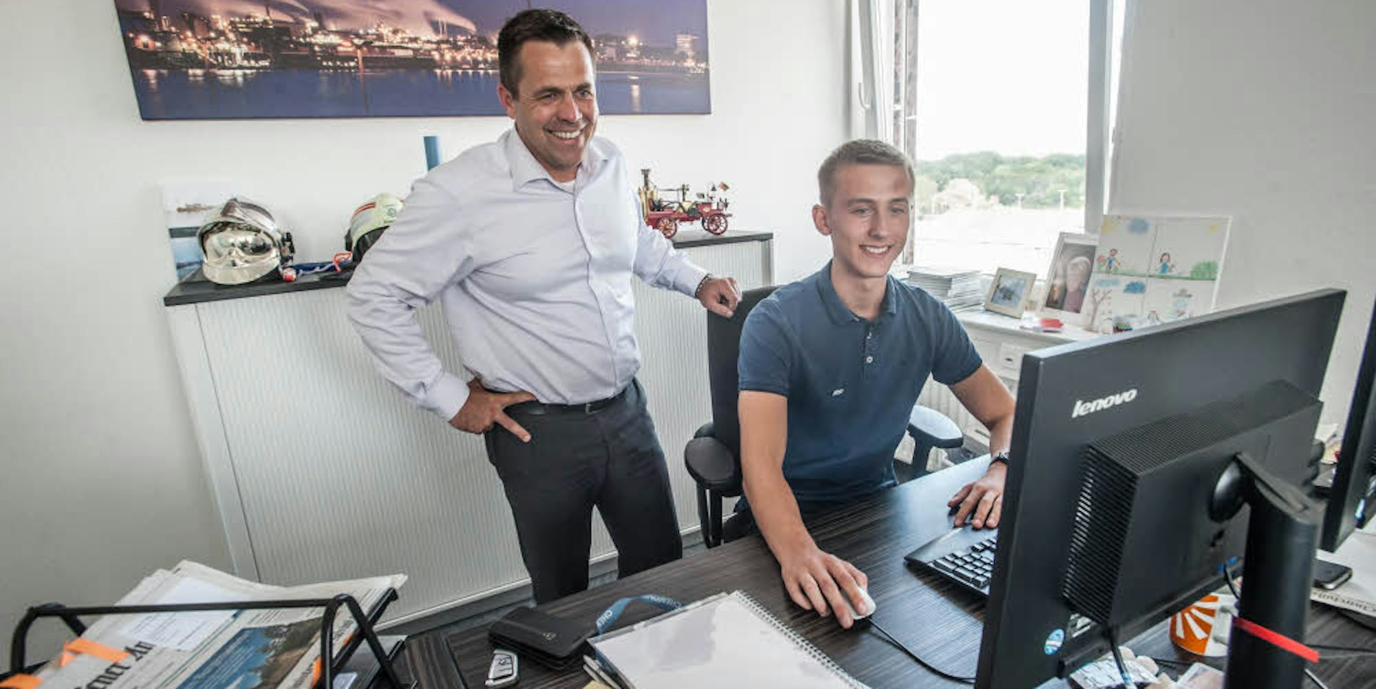 Was steht im Terminkalender? Erik John sitzt am Schreibtisch von Chempark-Chef Lars Friedrich (links). Der freut sich über den Schüler, der „hier gerade und klar durch die Tür gekommen ist“.