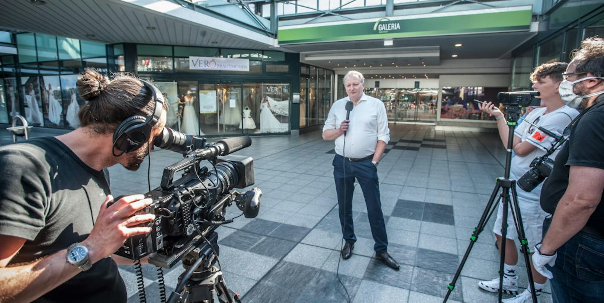 Frank Schönbergers City-Rundgang dient auch als Wahlkampf-Auftritt und wird von einem Team gefilmt.