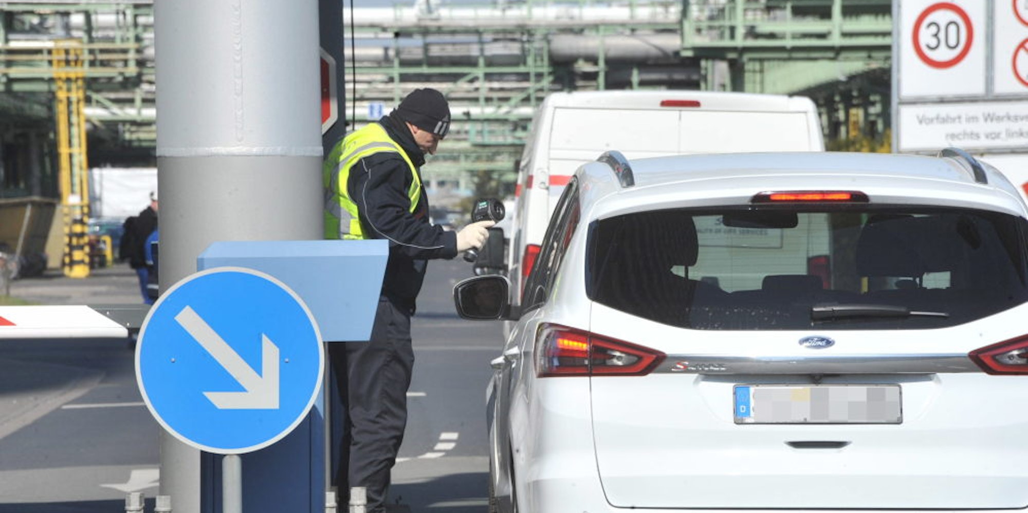 Neue Eingangskontrolle im Chempark: Ein Pförtner an Tor 2 misst die Temperatur durch das geöffnete Autofenster.