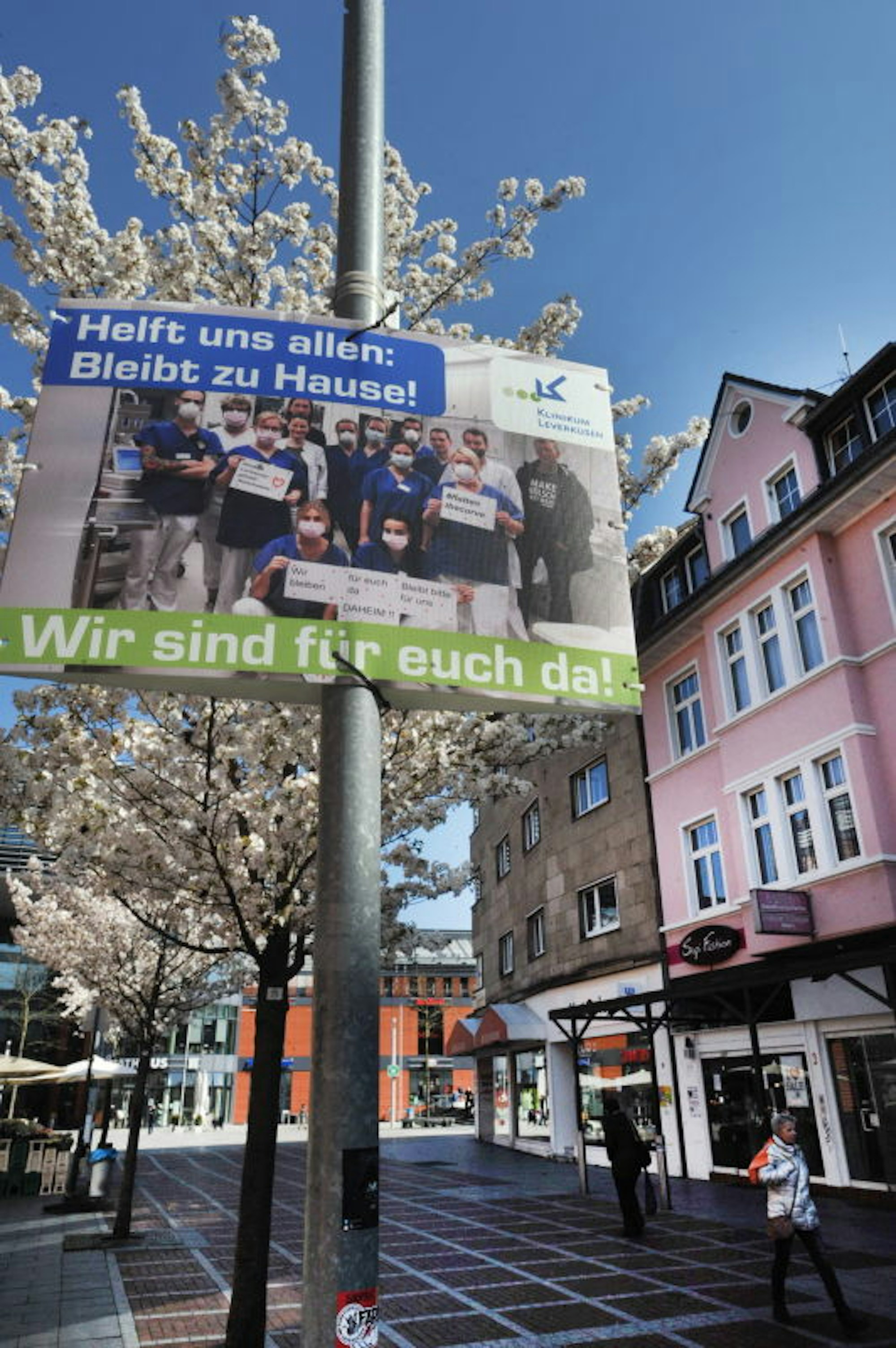 Eine Aufforderung des Klinikums hängt in der Fußgängerzone.