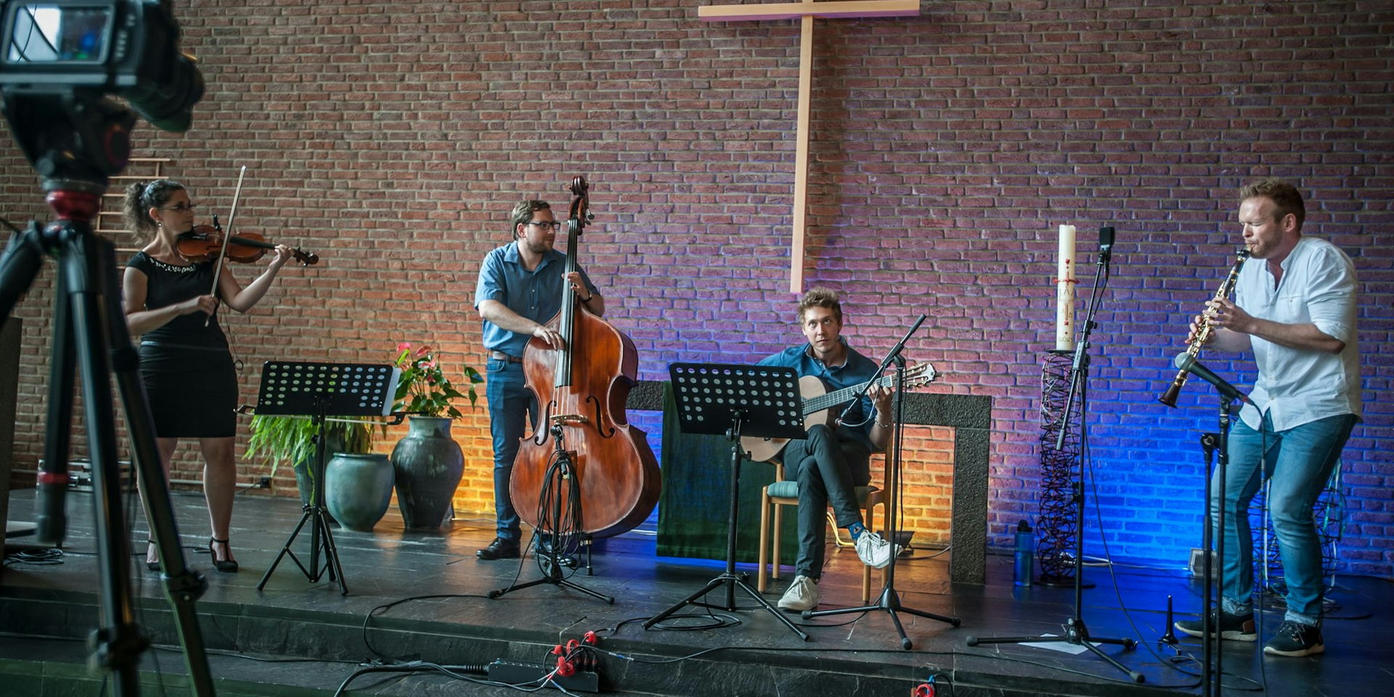 Vor etwa 90 Zuschauern in der Kirche und 70 Online-Gästen spielte das Leverkusener Ensemble „Crazy Freilach“ zeitgenössische Klezmermusik mit jiddischem Gesang. Die fünf ehemaligen Schülerinnen und Schüler der Musikschule Leverkusen wollen mit ihrer Musik das Erbe der osteuropäischen Juden lebendig halten. „Crazy Freilach ist ein Botschafter der Kultur für Leverkusen und Europa“, beschreibt Gutbier die Band. Begleitet wurde die Musikgruppe am Abend von humorvollen und nachdenklichen jüdischen Geschichten, erzählt von Christiane Willms.