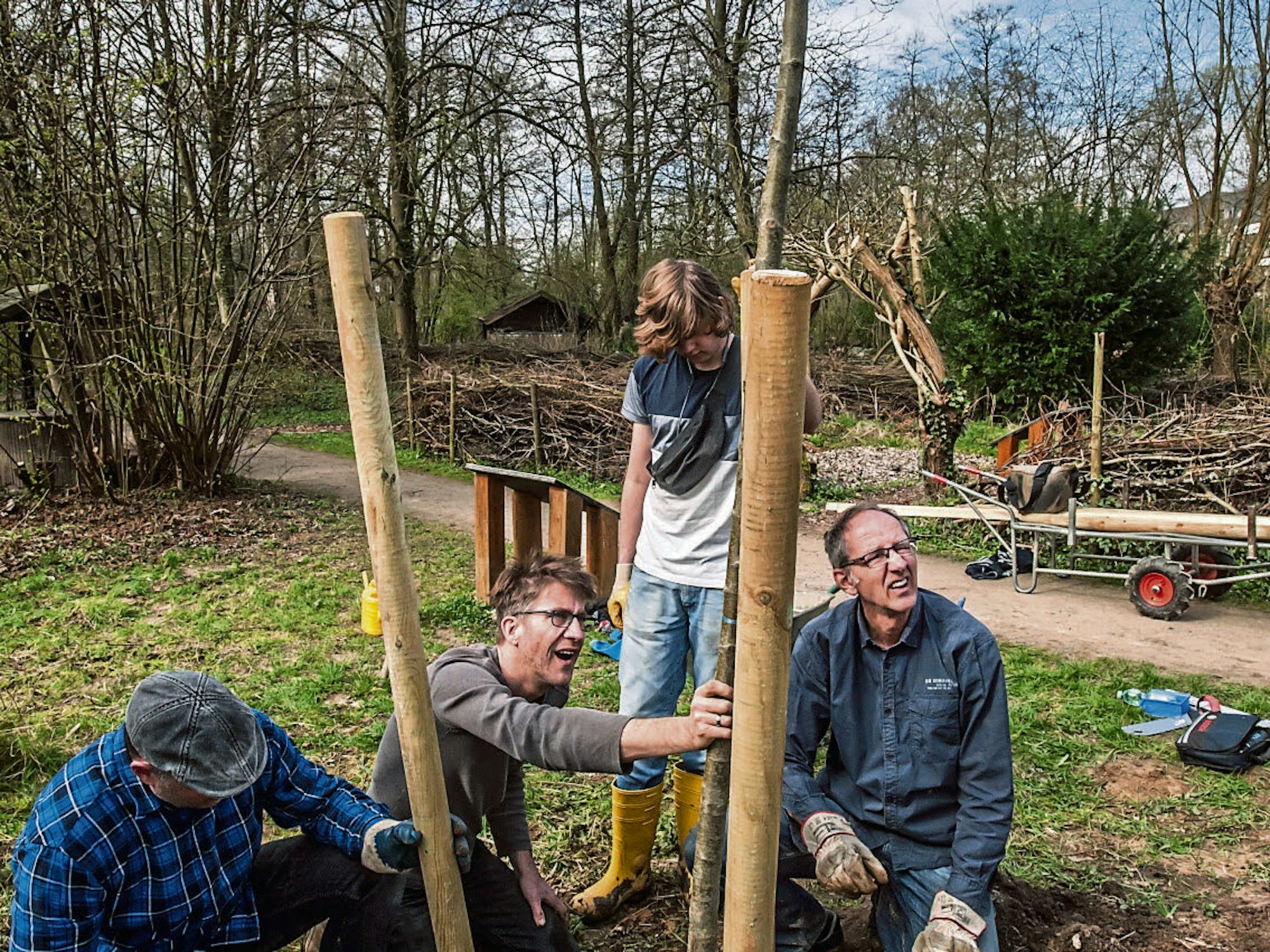 Surreal war sie, die Situation. Wie allerorts dieser Tage. Im Baum pfiff ein Zaunkönig. Amseln flogen über die nahe Wiese. Vor den Bienenstationen tummelten sich Wildbienen – „Unmengen“ von ihnen habe er in den vergangenen Tagen ausgemacht, sagte Hans-Martin Kochanek, Leiter des Naturgutes Ophoven. Der Frühling komme eben. Und dann waren da noch Imker Reinhold Glüsenkamp und der Schlebuscher Gesamtschullehrer Bernd Nafe: Sie pflanzten drei neue Bäume in den Bienengarten des Naturgutes. Und wussten nicht, ob sie nun lächeln oder doch eher traurig dreinschauen sollten.