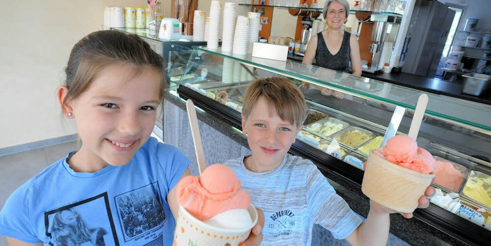 Lena und Jannis Schöpf lassen sich ihr Eis, umweltfreundlich verpackt in Biocup und Waffelbecher, schmecken.