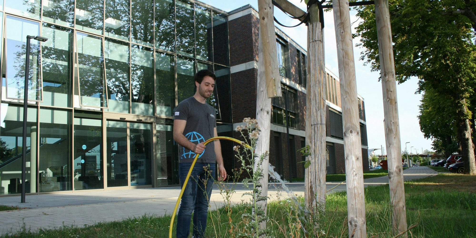 Adriano Trovato wässert in diesen Wochen allmorgendlich die jungen Kastanien vor dem Firmengebäude in Opladen.
