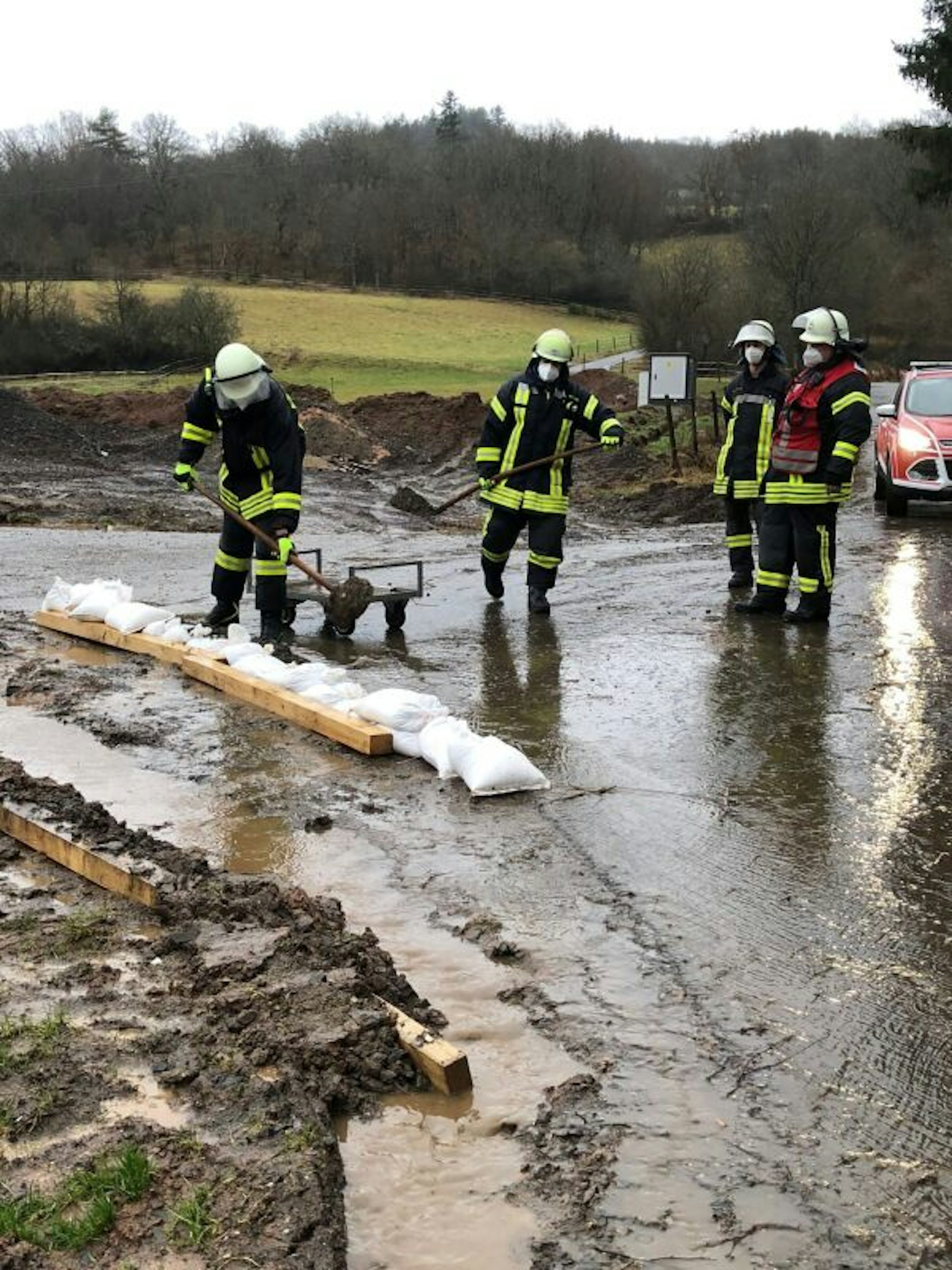 Die Feuerwehr sichert die Kita-Container in Olef mit Sandsäcken.