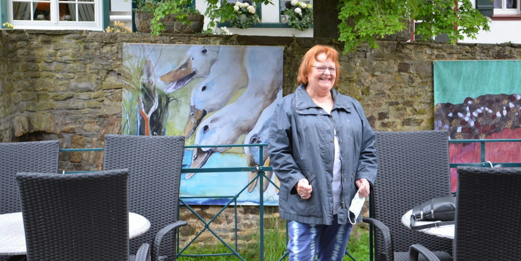 Die Originale, jeweils mit einer Größe von 30 x 30 bis 80 x 80 Zentimeter, wurden in Großformat von 2 x 2 Meter auf Lkw-Planen gedruckt. Die so entstandenen Werke werden auf einer Kunstroute durch die historische Innenstadt Bad Münstereifels präsentiert. Die Kunstwerke sind sieben Wochen lang in der Kernstadt, anschließend im Kurpark-Wäldchen oberhalb des Kurhauses und dann in Rodert zu sehen. Vielleicht haben einige Kunstfreunde dann das Glück, den einen oder anderen Künstler zu treffen und über die Werke zu sprechen. Am Sonntag war das kein Problem. Ein Besucherpaar traf am Entenmarkt Agi Saller-Franke, die sogleich über ihr Werk plauderte: „Die Wurzeln habe ich in Pastell gemalt und die Gänse in Aquarell.“