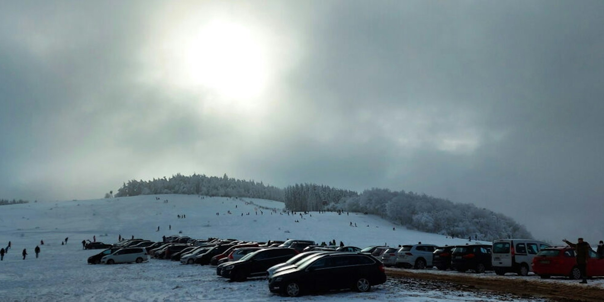 Ein paar Ecken weiter, unterhalb des größten der Rodelhänge am Michelsberg, ist da schon eher unklar, wie der Tag noch werden wird. Schnell hat sich an der Landesstraße, die wegen der Erreichbarkeit von Orten im Höhengebiet von Bad Münstereifel durch die Rettungsdienste nicht für den Verkehr gesperrt werden kann, der Wanderparkplatz „Bleielsnück“ gefüllt.