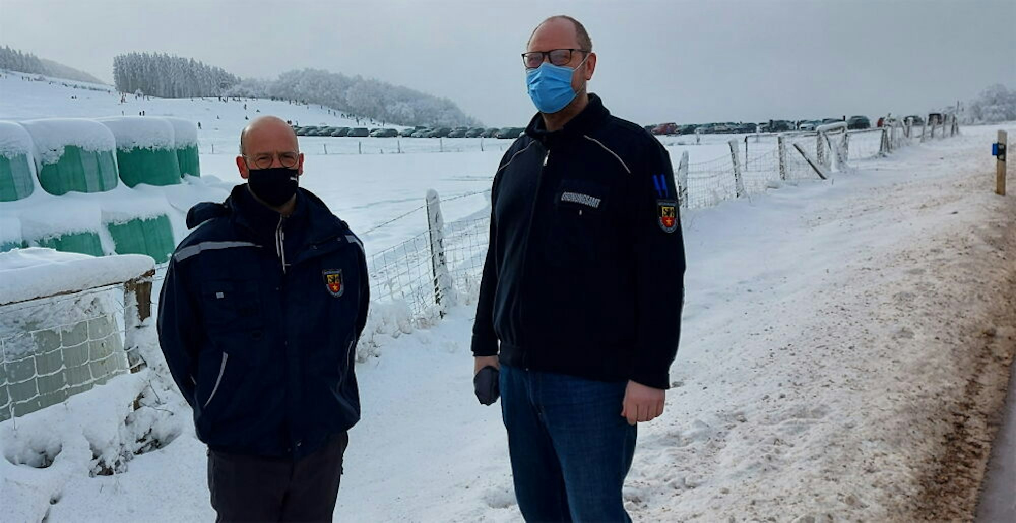 Doch von Besuchermassen ist noch nichts zu sehen. Dem stimmen die vier martialisch in dicke Schutzkleidung gepackten Beamten der Bereitschaftspolizei Köln zu, die gerade vom sich füllenden Parkplatz „Im Lindchen“ den Weg zum Rodelhang hinaufstapfen.