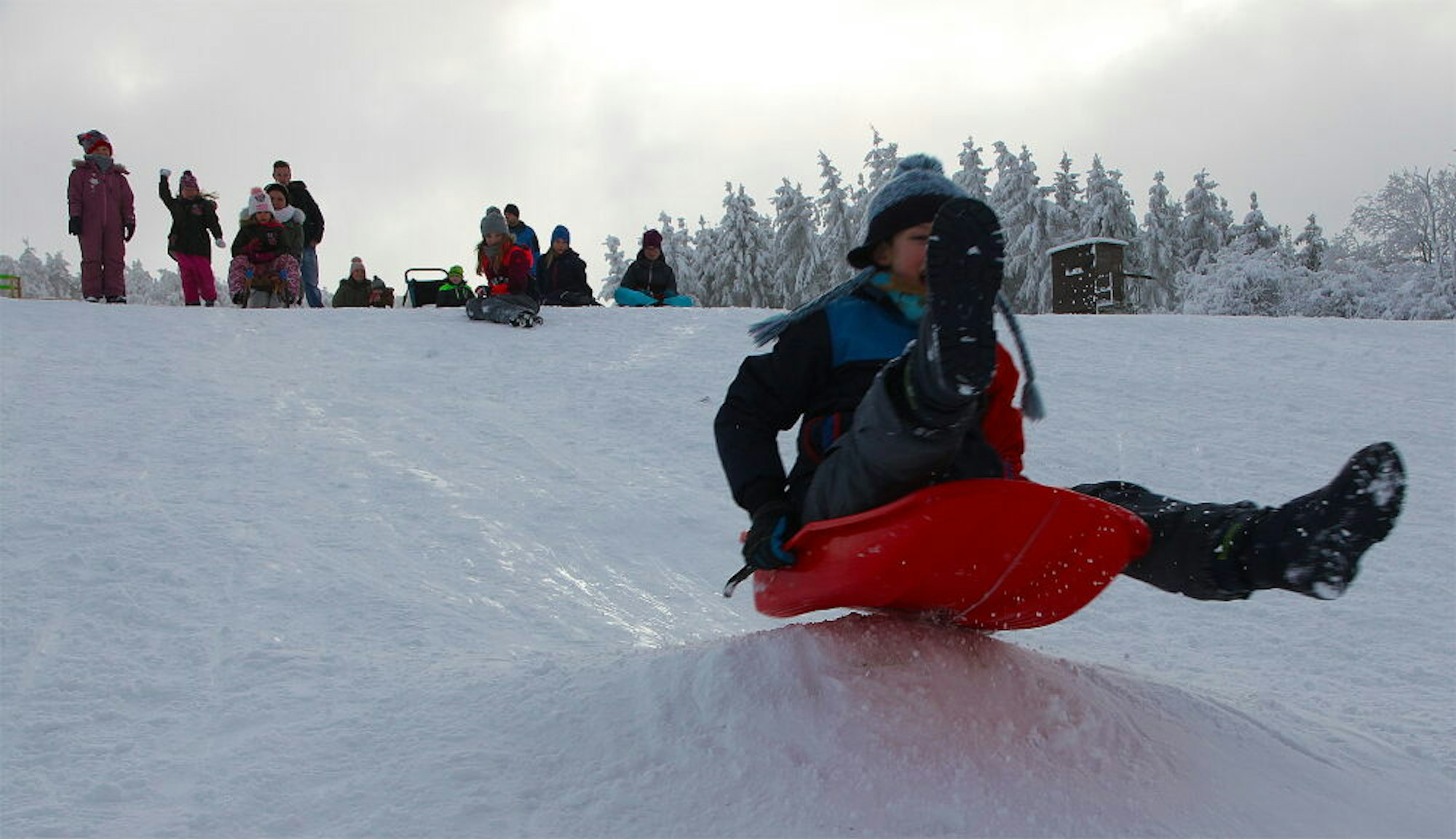 Doch sie irrt. Im Nebel tauchen immer mehr Familien mit ihren Kindern auf – Schlitten, Rodel, Reifen, Sitzpappen im Schlepptau. Die meisten kommen, wie sich zeigen wird, wie Melanie Kriegel aus der näheren Umgebung. „Als Ortsansässiger will man ja schließlich auch was von der Eifel haben“, macht Thilo Lenhard aus Euskirchen gewisse Rechte scherzhaft geltend. Die Söhne Janic und Johann werden derweil ebenfalls, talwärts auf ihren Untersätzen sausend, von der Nebelwand verschluckt.