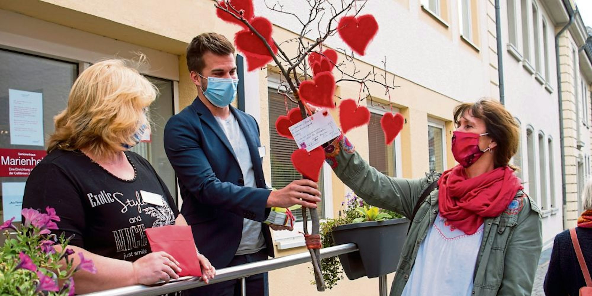 „Eine ganz tolle Aktion“, freute sich Dennis Oepen, Leiter des Seniorenhauses Marienheim, der den Umschlag und den dekorierten Ast für die Empfangstheke am Eingang mit Ute Nitschke-Herrmann entgegennahm. Das Geld werde für ein gemeinsames Grillen der 84 Angestellten verwendet, so die Vorsitzende der Mitarbeiter-Vertretung. Denn das sonst übliche Mitarbeiterfrühstück und andere Großveranstaltungen mussten wegen der Corona-Pandemie abgesagt werden. „Wie Sie das einsetzen, ist uns egal. Hauptsache, es kommt den Mitarbeitern zugute“, ergänzte Ela Rübenach augenzwinkernd.