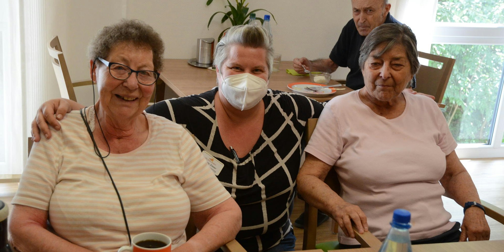 Wieder in der gewohnten Umgebung: Pflegedienstleiterin Brigitte Zimmer mit Bewohnern des Alten Stadttors.