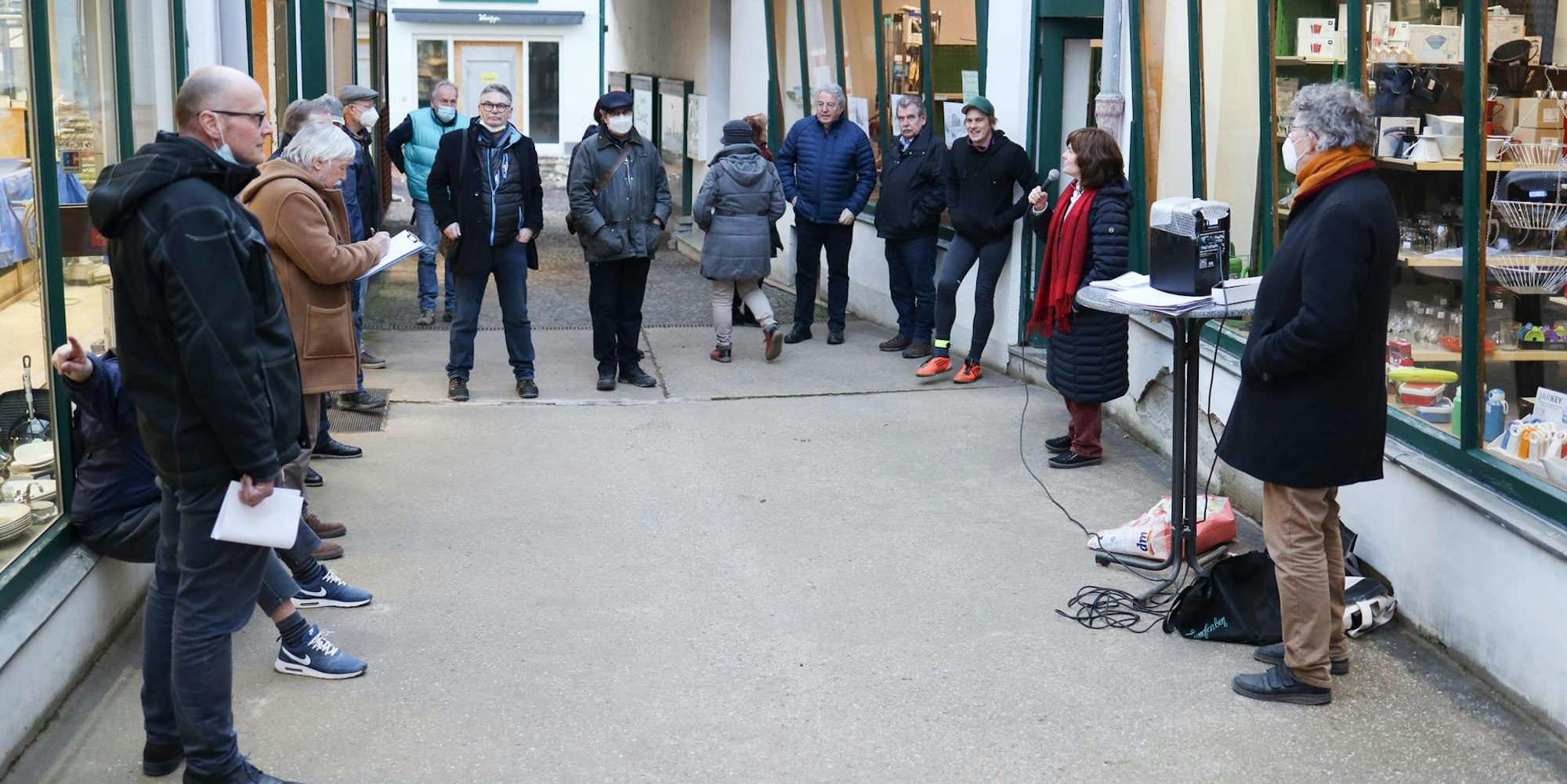 Ergebnisse der Bürgerbeteiligung stellte Martina Frenzel von der Initiative „Neugestaltung der Kernstadt“ im Lichthof des Geschäfts von Hubert Roth vor.