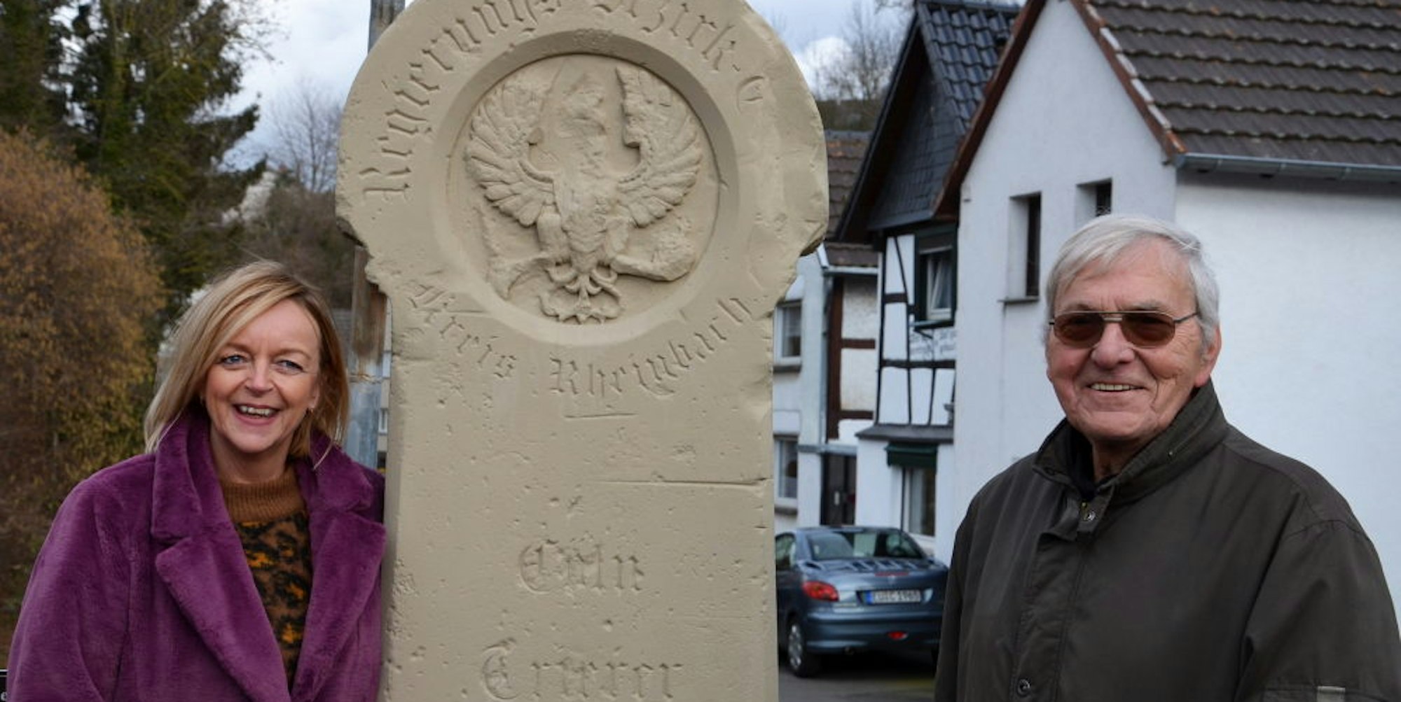 Es ist der letzte seiner Art im Bad Münstereifeler Stadtgebiet: Bürgermeisterin Sabine Preiser-Marian und der Vorsitzende des Iversheimer Dorfverschönerungsvereins, Helmut Ruß, mit dem Preußischen Meilenstein.