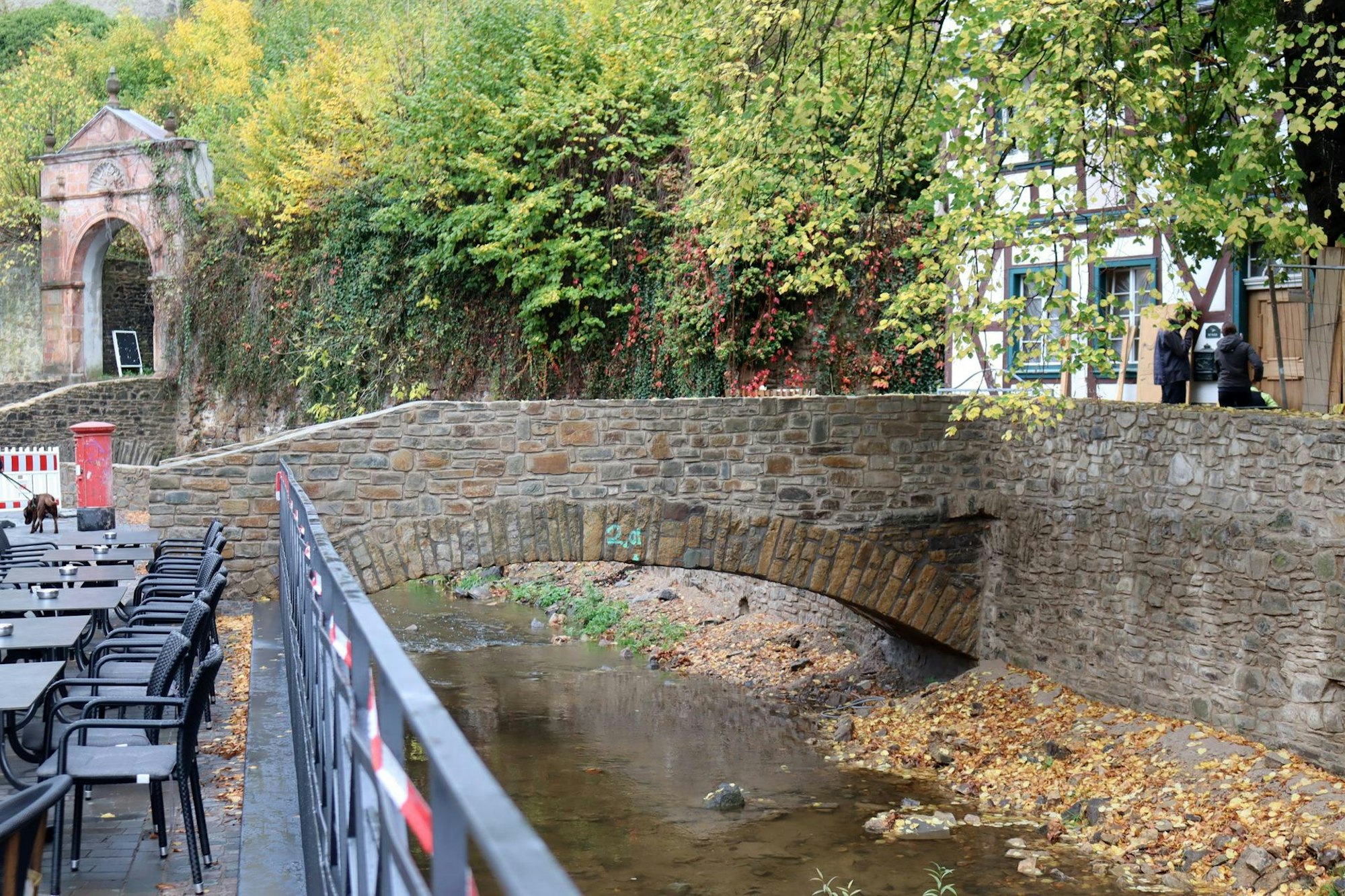 Die zerstörten Erftmauern in der Kernstadt seien zu 95 Prozent wiederaufgebaut, auch die Abdeckplatten werden als Abschluss bereits verlegt. Das neue Geländer mit integriertem Hochwasserschutz entlang der Erft ist ebenfalls installiert.