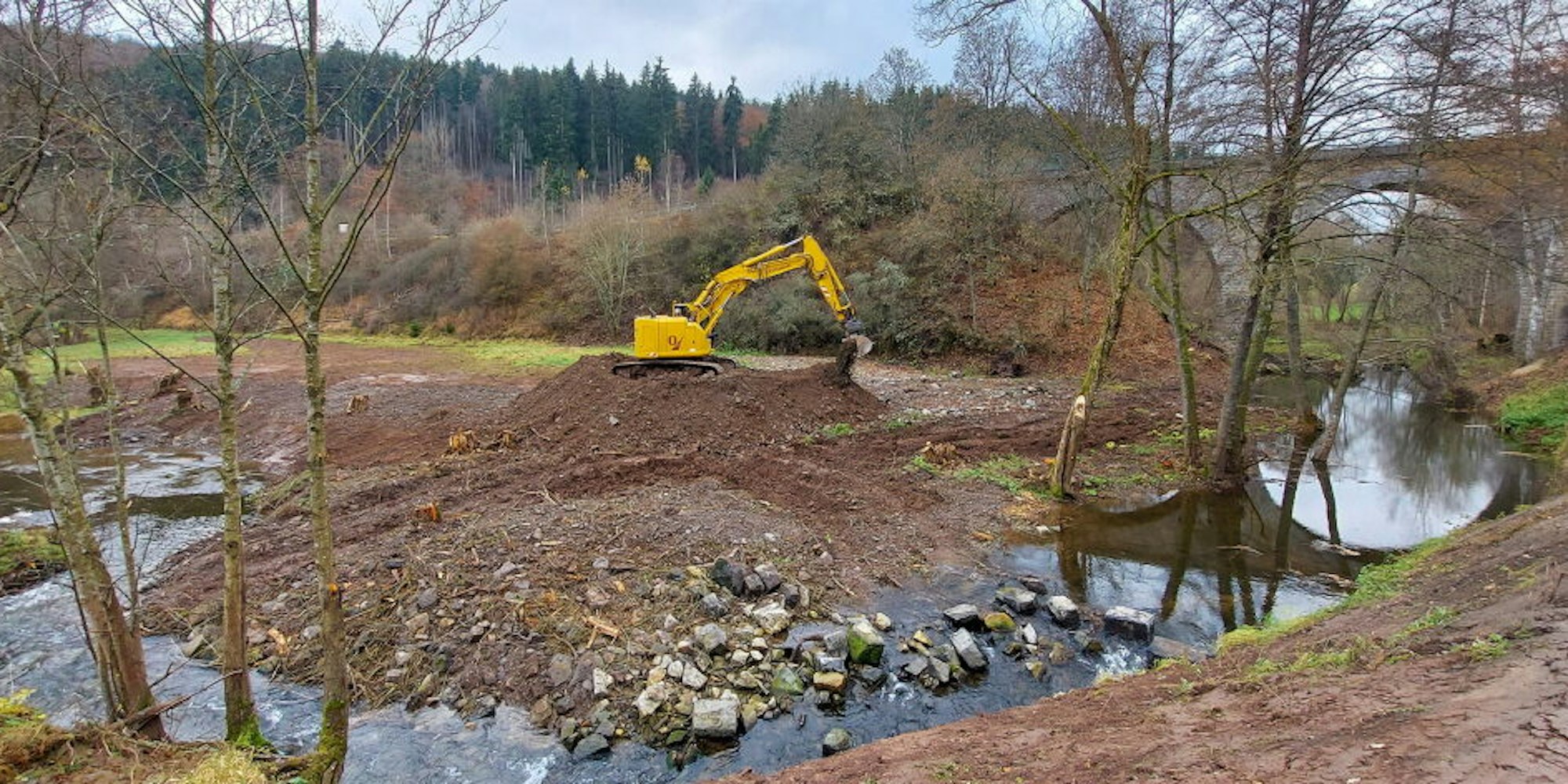 Mit Martin Peetz ist die Reise nun am Mühlenbach neben der Böschung der L115 angekommen. Der Bach kommt von Freilingen und fließt bei Ahrhütte in die Ahr. Auf halber Strecke ist Thomas Hansen in der Bachsenke mit seinem Bagger bei der Arbeit: „Wir holen Totholz und umgefallene Bäume aus dem Bach.“ Danach werde mit dem Bagger das Bachbett neu profiliert. Wie lange der Schlossthaler das schon an den Bächen und der Ahr macht? „Seit dem 15. Juli“, sagt Hansen. Und wie lange noch? „Auf jeden Fall bis zum 1. März.“ Dann droht ein Stopp aus Naturschutzgründen: Im März beginnt die Brutzeit der Vögel.