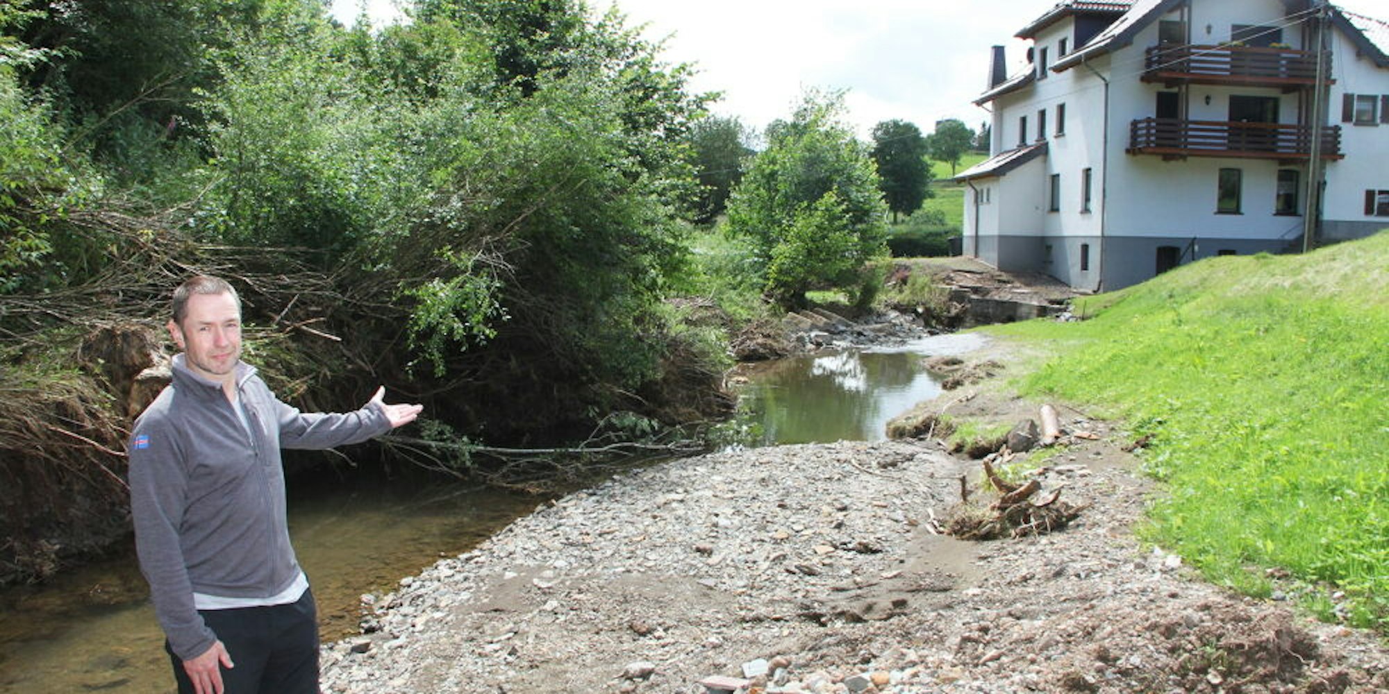 Erleichtert ist Jürgen Schmidt vom Forellenhof: Der Mülheimer Bach stieg zwar auf zweieinhalb Meter Höhe an, doch nur ein Keller wurde überflutet.