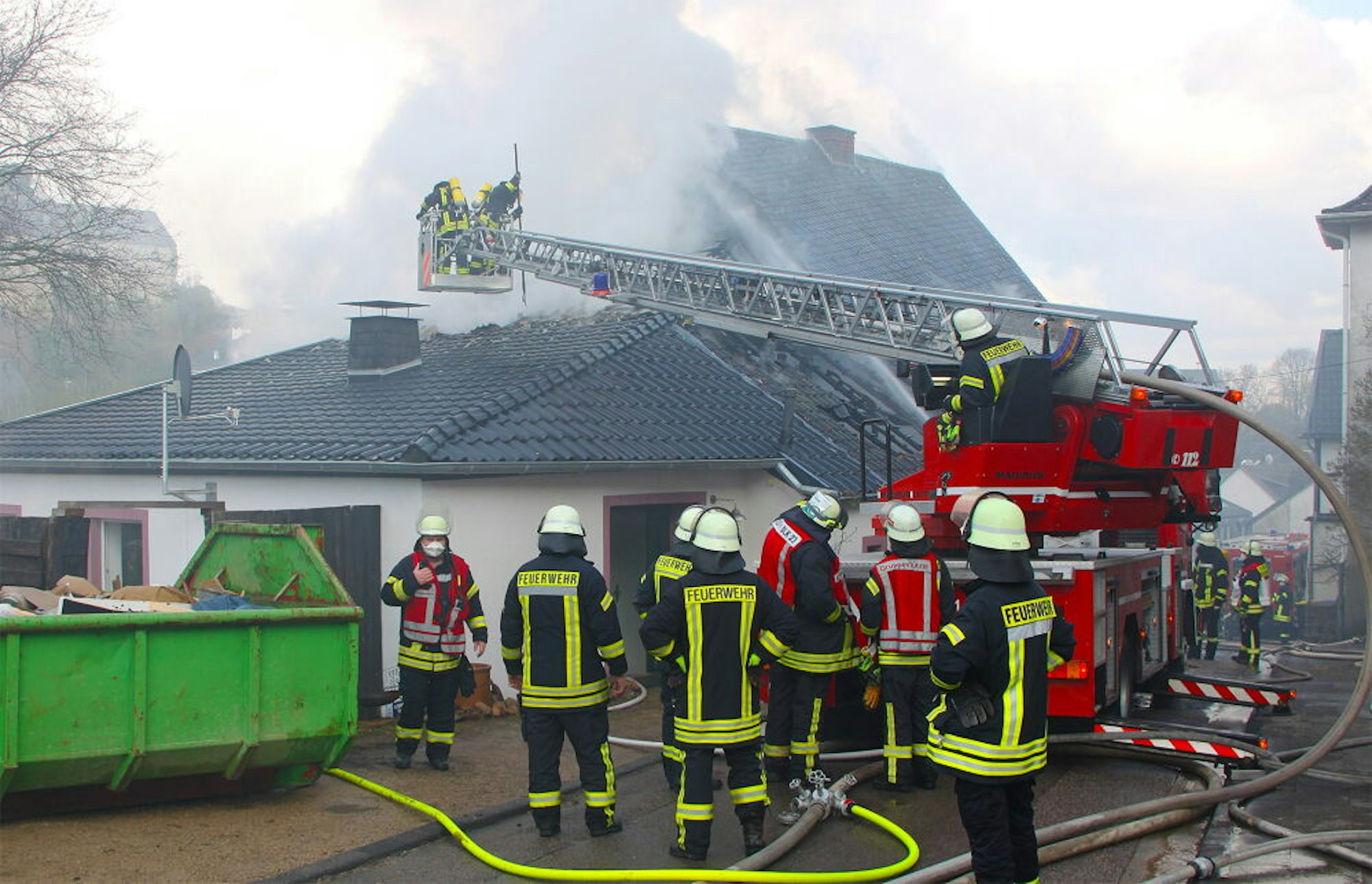 Auch von der Drehleiter aus bekämpften die Feuerwehrleute den Brand.