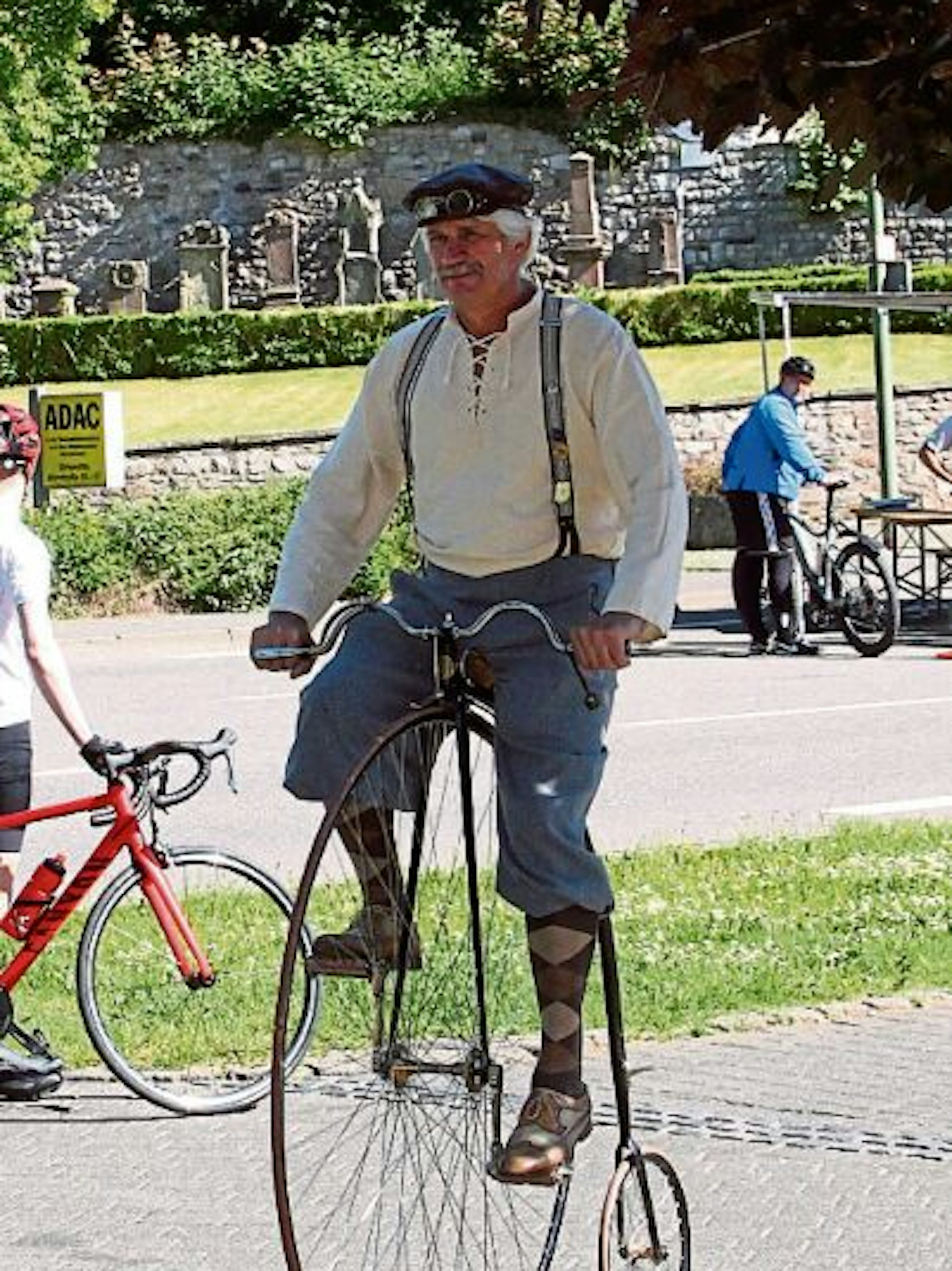 Alles das nahm auch Gerd Jajchik aus Honnef zur Kenntnis. Wenn auch aus einer gewissen Höhe herab. Jajchik, in Schiebermütze, Schutzbrille, Pluderhose und edel handgenähtem Schuhwerk im Stil des leicht versnobten Freizeitsportlers der Wende des 19. zum 20. Jahrhundert gekleidet, fuhr auf seinem originalen Hochrad von 1880 die Tour de Ahrtal mit. 48 Zoll Vollgummi vorne, 20 Zoll hinten, dazu am Rahmen ein kleiner Stahltritt für den schwungvollen Abstieg. Das will gelernt sein, ansonsten drohe „der tiefe Fall“, so Jajchik. Selbstredend ist er mit seinem Gefährt Mitglied in einem Verein gleichgesinnter Freunde des Großrades.