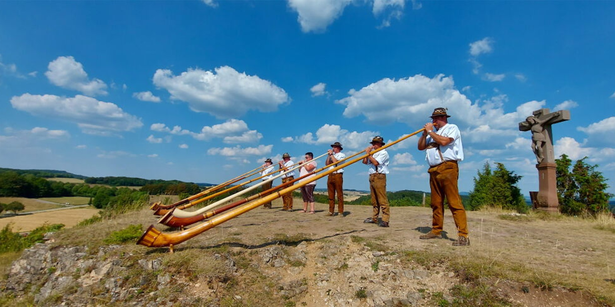 Blankenheim-Alendorf – Nachdem sich auch das Alendorfer Wacholderfest in den Reigen der wegen der Corona-Pandemie abgesagten Veranstaltungen einsortiert hatte, gaben die Eifeler Alphornissen kurzentschlossen am Samstag ein Open-Air-Konzert vom Gipfelkreuz des Kalvarienbergs über Alendorf.