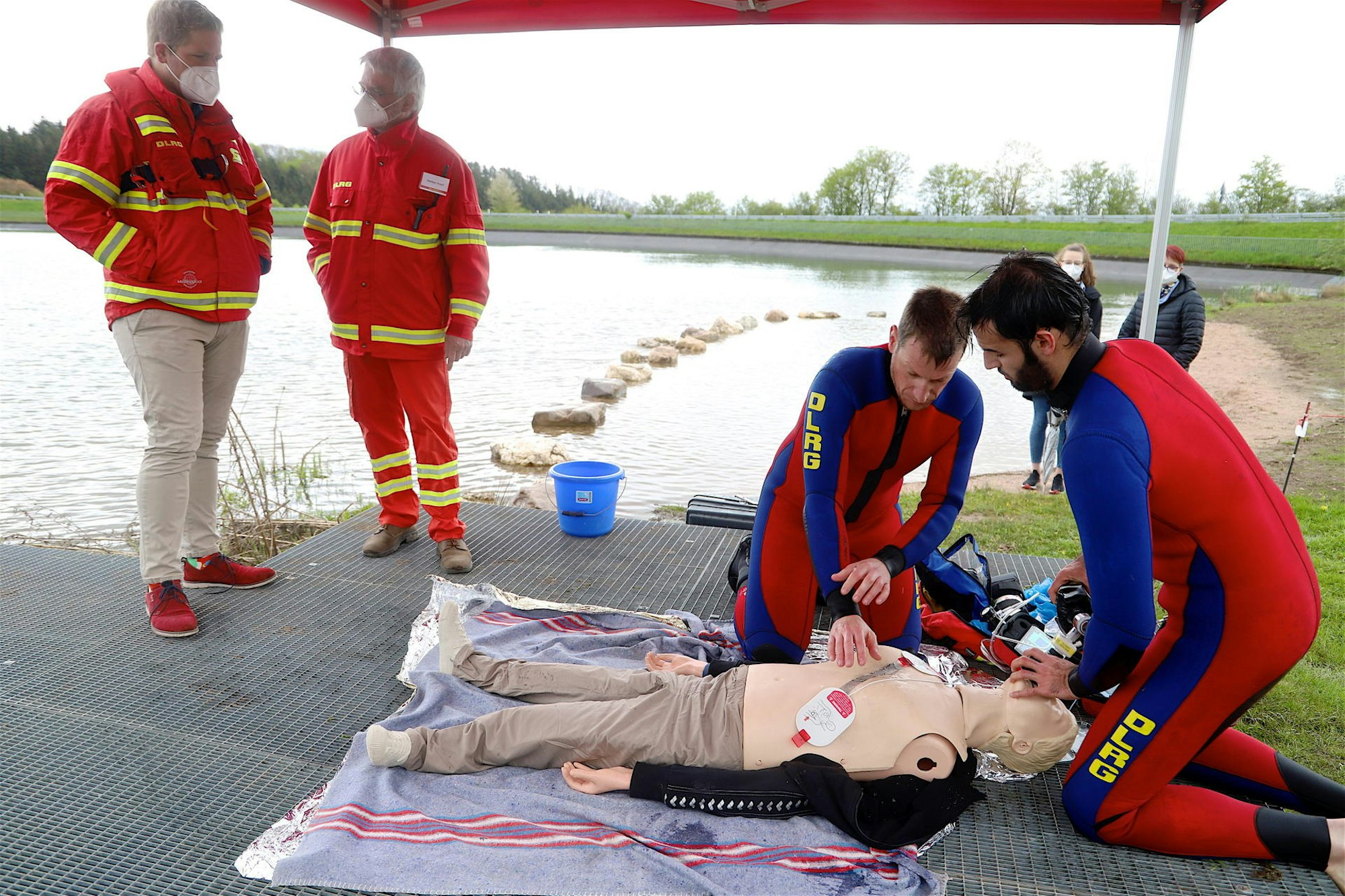 An der Station am Freilinger See sind 30 Rettungsschwimmer aktiv, zehn davon sind als Taucher ausgebildet. Drei DLRG-Schwimmer sind an den Wochenenden vor Ort und wachen über die Gesundheit der Schwimmer. Die Hauptaufgabe am See sei die Erste Hilfe, erläuterte Wachleiter René Loben. 43 Mal mussten sie im vergangenen Jahr tätig werden, in drei Fällen musste auch der Rettungsdienst anrücken. Auch wenn im benachbarten Eifel-Camp ein Notfall passiert, werden die Helfer in den markanten gelb-roten Jacken gerufen, im Jahr 2020 war das zweimal der Fall.
