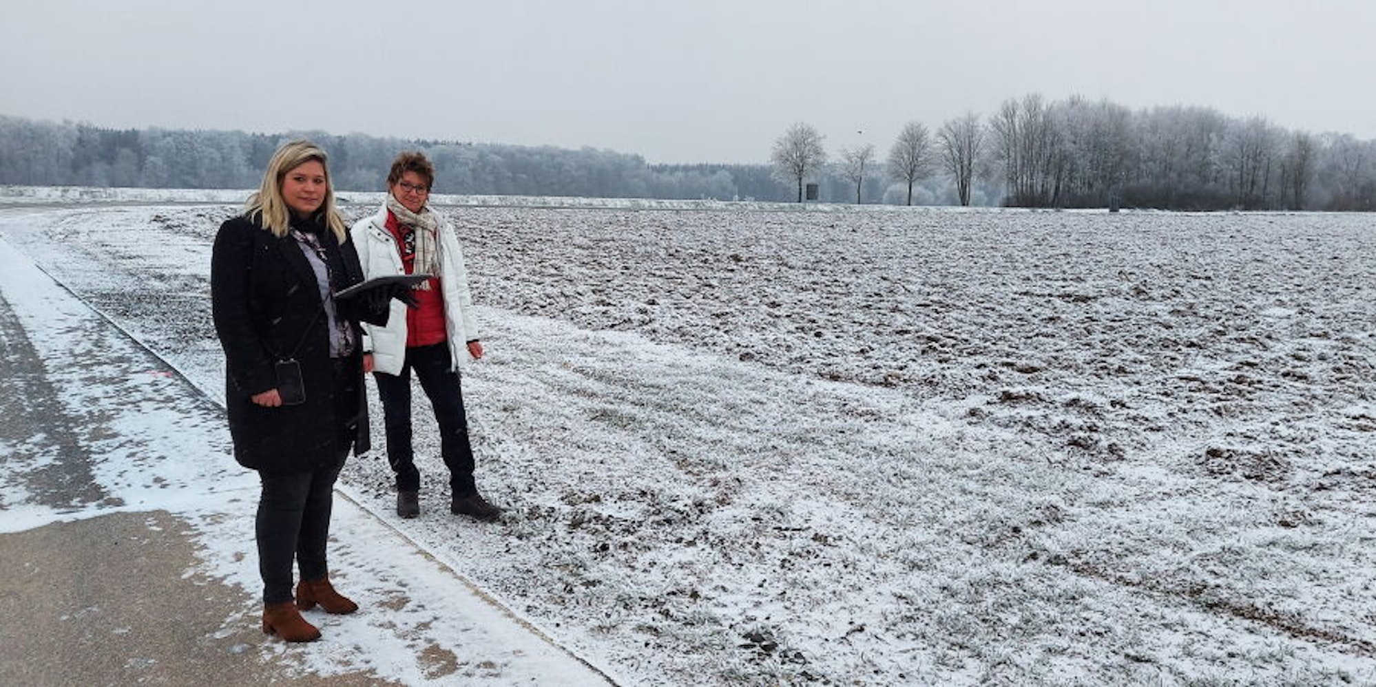 Am Rand des geplanten Gewerbegebiets oberhalb von Blankenheim stehen Bürgermeisterin Jennifer Meuren (l.) und Abteilungsleiterin Maria Nelles. Die Gemeinde befindet sich in Grundstücksverhandlungen mit den Landwirten, denen die Parzellen gehören.