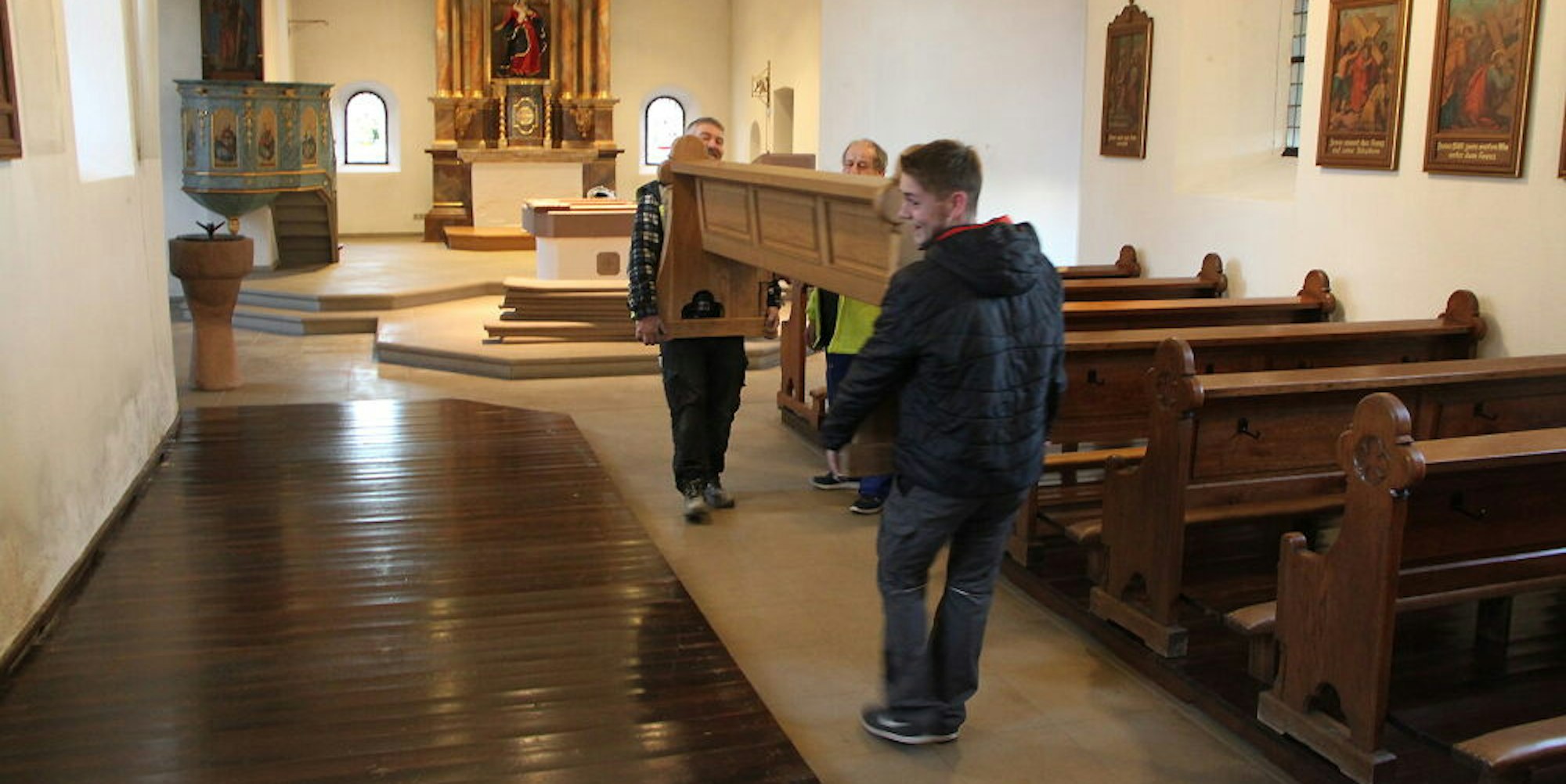 Vor wenigen Tagen stand deshalb das Ausräumen der Pfarrkirche an. Um Unterstützung dabei war im Pfarrbrief geworben worden und ein halbes Dutzend Helfer packte an.