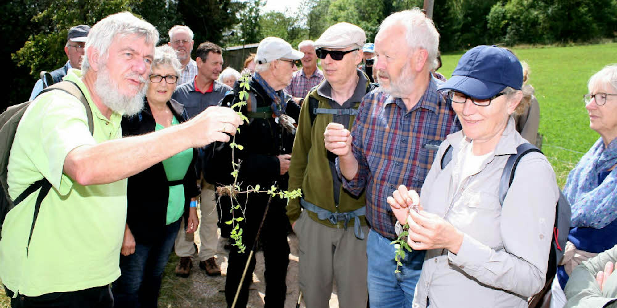 Zu Besonderheiten der Flora im Kalkmagerrasengebiet der Wacholderhänge wurden die Teilnehmer der Wanderungen geführt. Wildpflanzen und -kräuter im insgesamt 650 Hektar großen Schutzgebiet Lampertstal wurden von Dr. Karl-Heinz Linne von Berg genauso erläutert wie Grundsätzliches: „Eigentlich müsste hier ein Wald stehen. Was wir hier sehen, ist eine Kulturlandschaft. Über Jahrhunderte wurden Schafe zur Beweidung eingesetzt. Die lassen stehen, was ihnen nicht schmeckt. Etwa den Wacholder.“