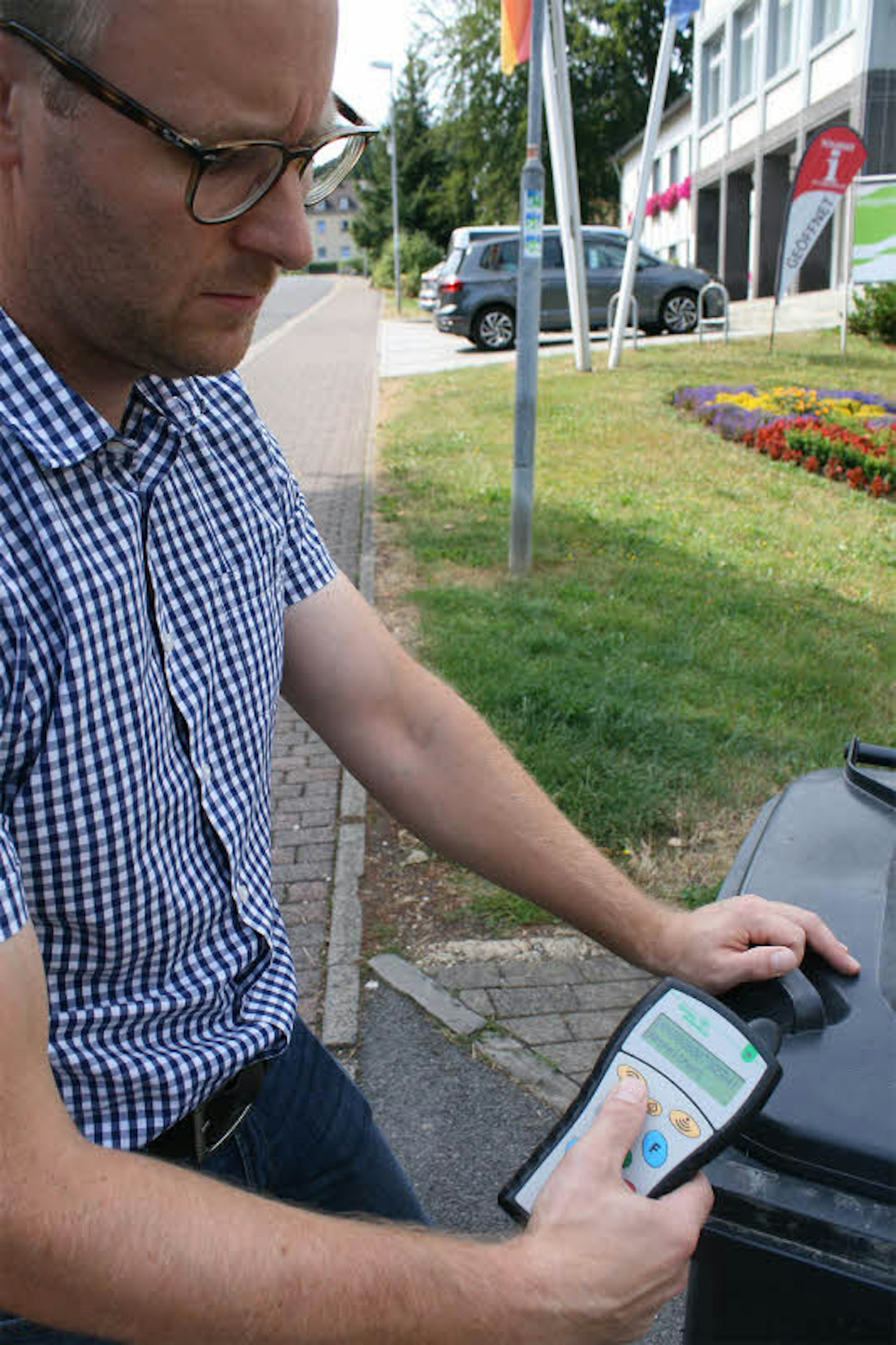 Das Lesegerät am Chip einer Mülltonne zeigt Martin Berners von der Gemeinde Hellenthal.