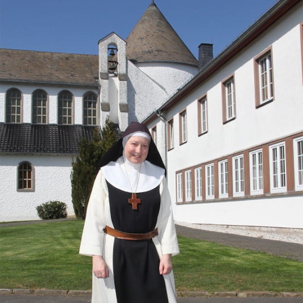 Äbtissin M. Gratia Adler im Innenhof der Abtei Maria Frieden.