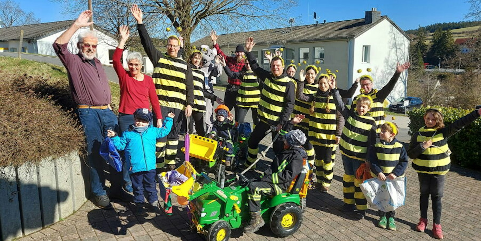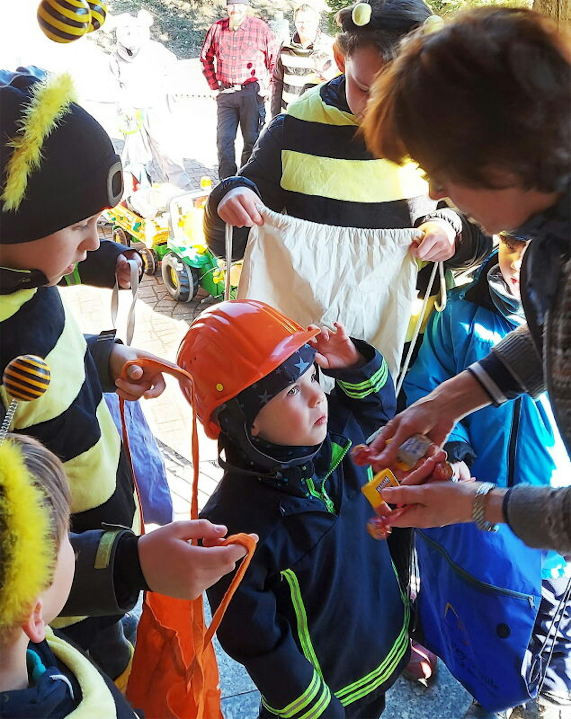 Das fängt für ein halbes Dutzend Kinder zwischen drei und zehn Jahren und fast ein Dutzend Erwachsene – die Glorreichen im Biene-Maja-Kostüm – schon an der ersten Adresse gut an. „Wir werden vermutlich eineinhalb bis zwei Stunden unterwegs sein“, so Klinkhammer. Und schon zieht der kleine Zoch ein Haus weiter zu Dorothea und Erwin Rütz. Das Ehepaar hat Sohn, Schwiegertochter und zwei Enkel in der bunten Gruppe dabei. Natürlich gibt es auch hier reichlich Süßes. Und auch Erwin Rütz erinnert sich an seine Kindheit, als er Liedchen singend von Haus zu Haus ging – aber auch zum Metzger oder Bäcker, wo es ein Stück Wurst oder Kuchenteilchen und Brötchen gab. Für die „Glorreichen“ ist die Aktion am Ende des Tages ein Erfolg.