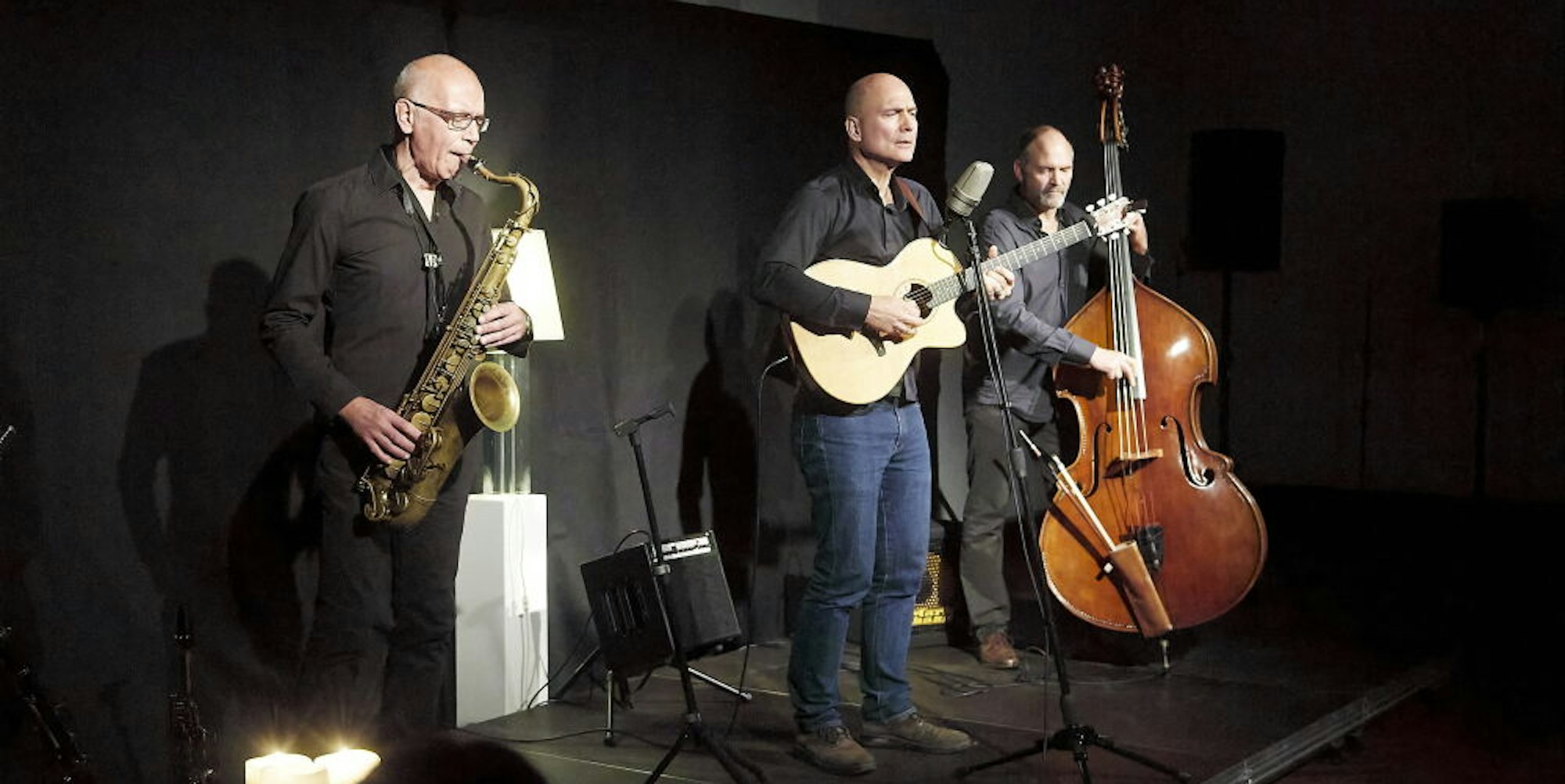 Der Gitarrist und Rezitator Oliver Steller trat mit seinem Programm über den Dichter Rainer Maria Rilke in Kronenburg auf, begleitet von Bernd Winterschladen (l.) und Dietmar Fuhr.