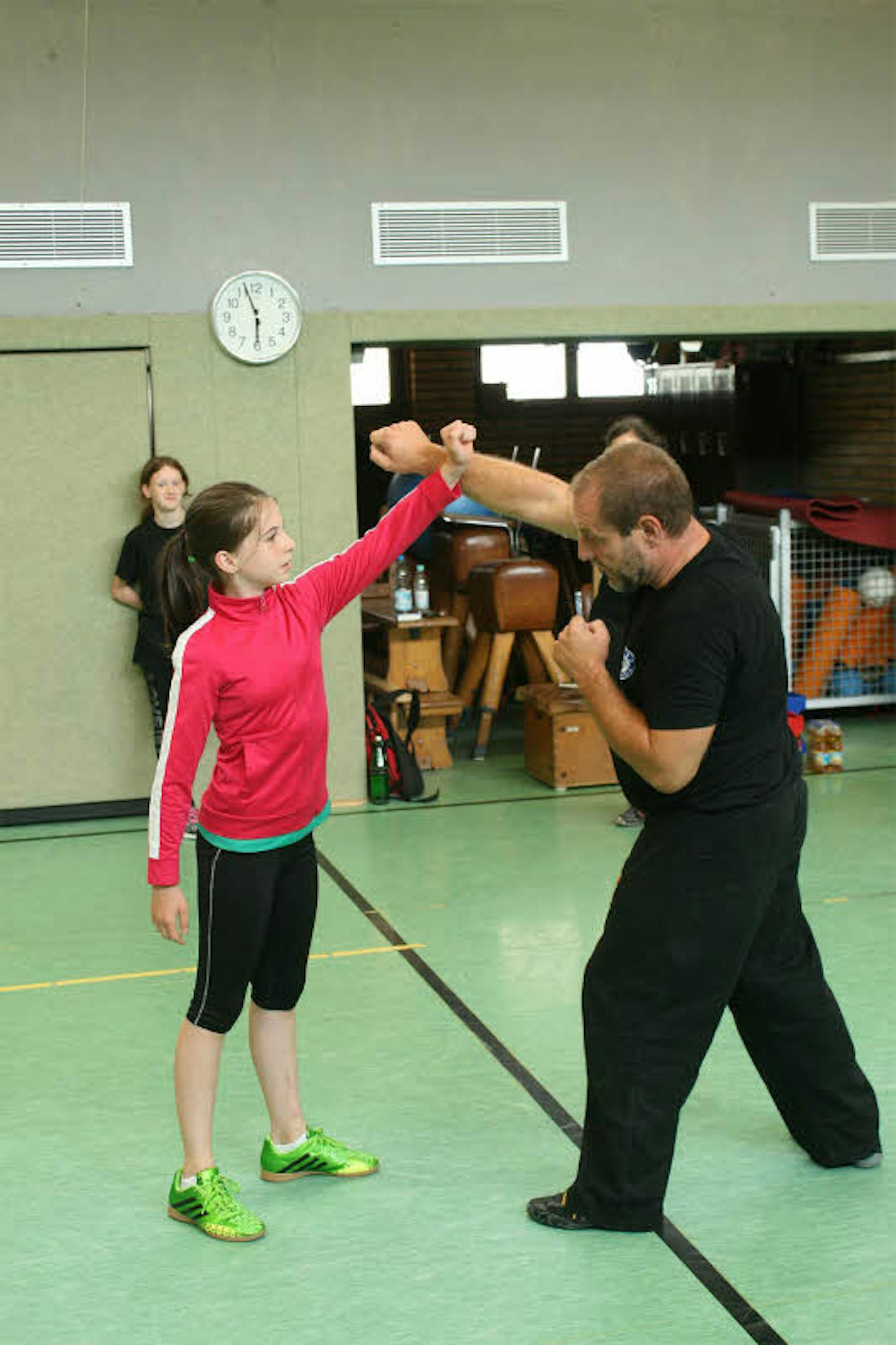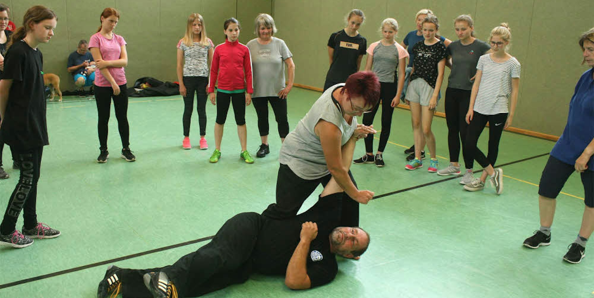 „Was die Mädchen und Frauen an Grundkenntnissen für die Straße brauchen, das können wir ihnen in diesen eineinhalb Tagen beibringen“, sagt Thomas Becker. Wie geht man mit Angriffen bei einem drohenden Faustschlag oder Würgeversuch um? Wie wehrt man sich gegen die Überwältigung durch einen Gegner, der einen auf den Boden geworfen hat?