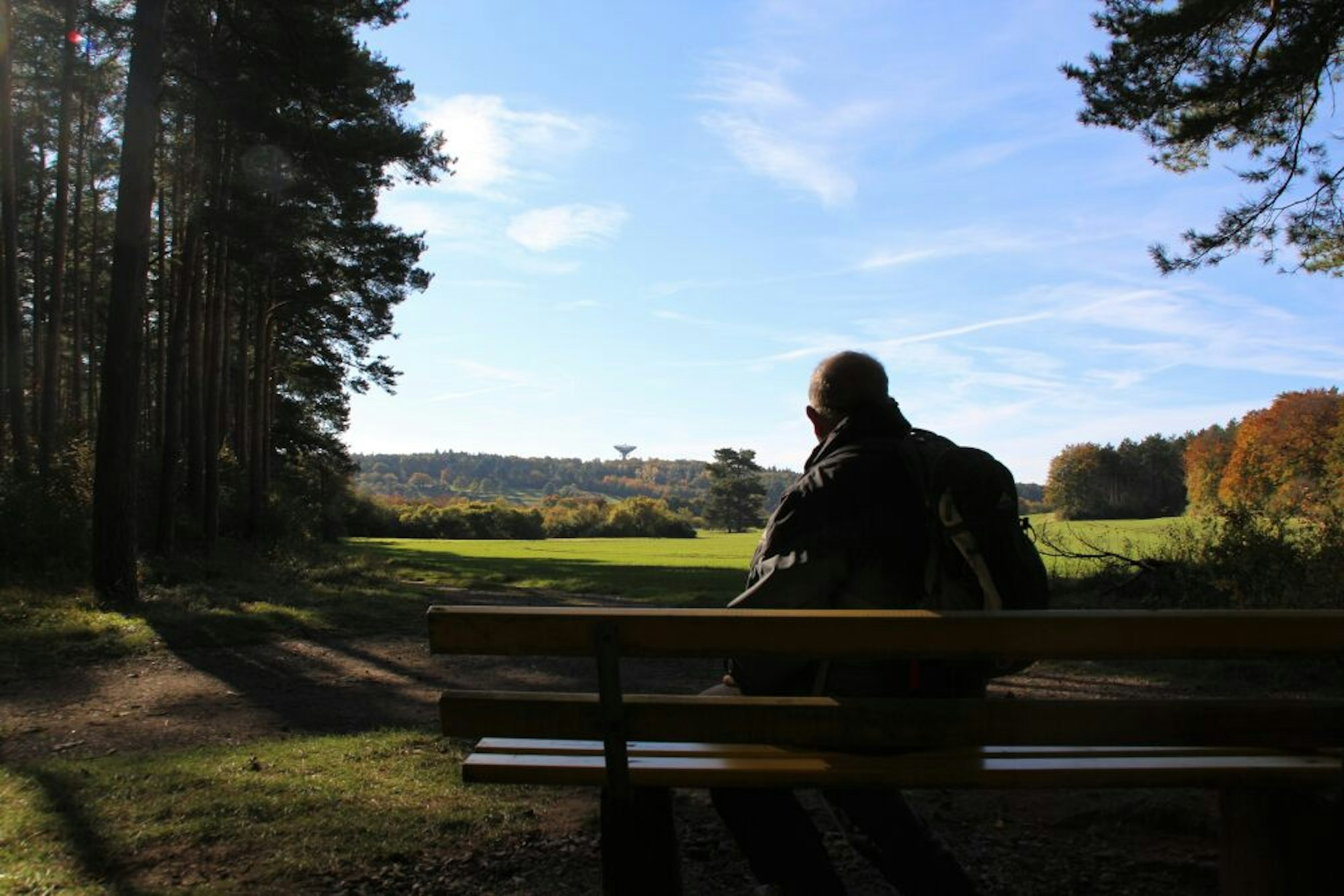 Oben angekommen, stoßen wir auf eine Lichtung, wo eine Bank uns zu einer Pause einlädt. „Snacks, Wasser und auch eine Brotzeit gehören einfach dazu“, sagt Müller. Von der Bank aus sehen wir auch das Radioteleskop auf dem Stockert, das 1956 errichtet wurde. „Seit 1999 steht die Anlage als Industriedenkmal unter Denkmalschutz“, weiß Müller. Zuvor nutzten unter anderem die Uni Bonn und das Max-Planck-Institut für Radioastronomie die Anlage.