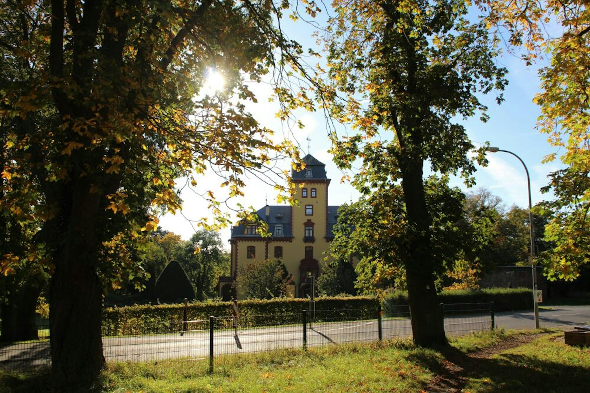 Los geht es am Parkplatz der Bruder-Klaus-Kapelle in Wachendorf, gleich neben dem Sportplatz. Wir queren zu Beginn einmal die Kreisstraße 44 und folgen einer alten Kastanienallee, die uns direkt auf das Schluss Wachendorf zumarschieren lässt. Das bereits 893 urkundlich zum ersten Mal erwähnte Schloss befindet sich heute in Privatbesitz; von der Straße aus haben wir einen schönen Blick auf das dreigeschossige Herrenhaus mit dem sechsgeschossigen Mittelturm.