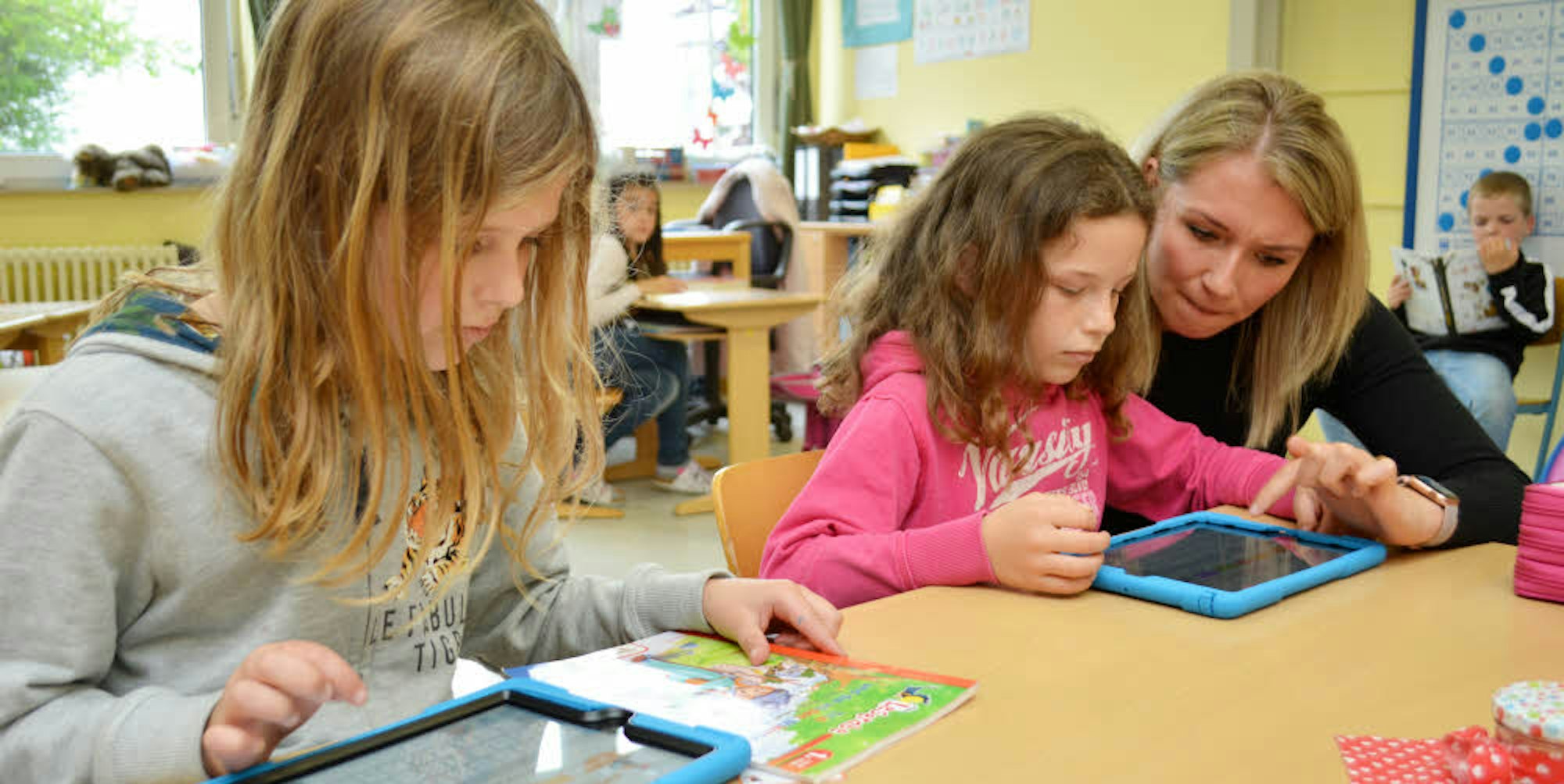 Ortstermin in der Grundschule: Marcella Willms demonstriert, wie die neue Technik in den Unterricht integriert wird. Es ist Lesestunde, alle schmökern eifrig in einem Buch. Diejenigen, die das Tablet ergattern konnten, müssen Multiple-Choice-Fragen beantworten, die ihnen das Programm „Antolin“ stellt.