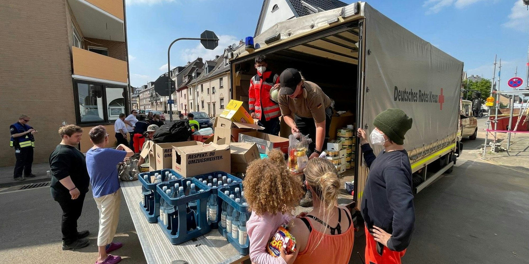 Mit Lebensmitteln versorgten Helfer des DRK unmittelbar nach der Flut Betroffene in Euskirchen. (Archivbild)