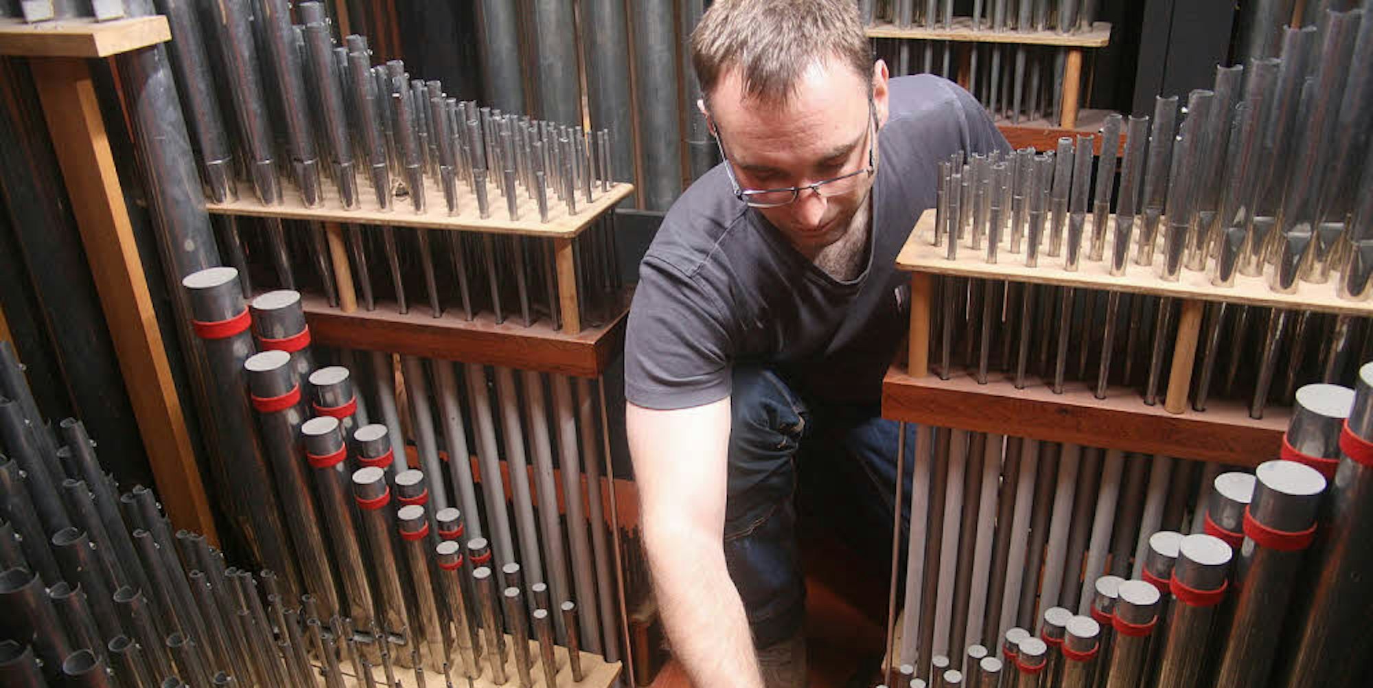 Feinarbeit: Markus Moutschen überprüft im Hauptwerk der Gemünder Orgel mit dem Stimmeisen jede Pfeife.