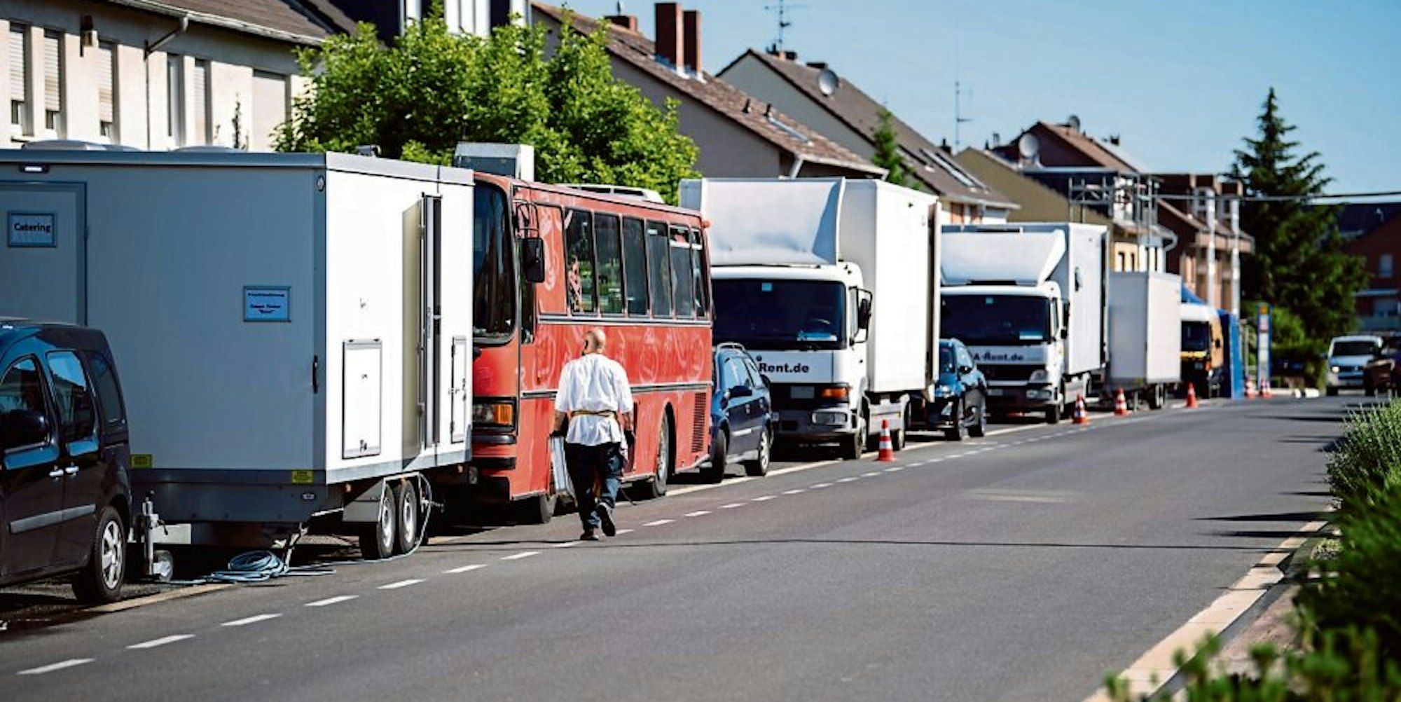 An der Billiger Straße in Euskirchen sind zahlreiche Filmproduktionsfahrzeuge abgestellt worden.