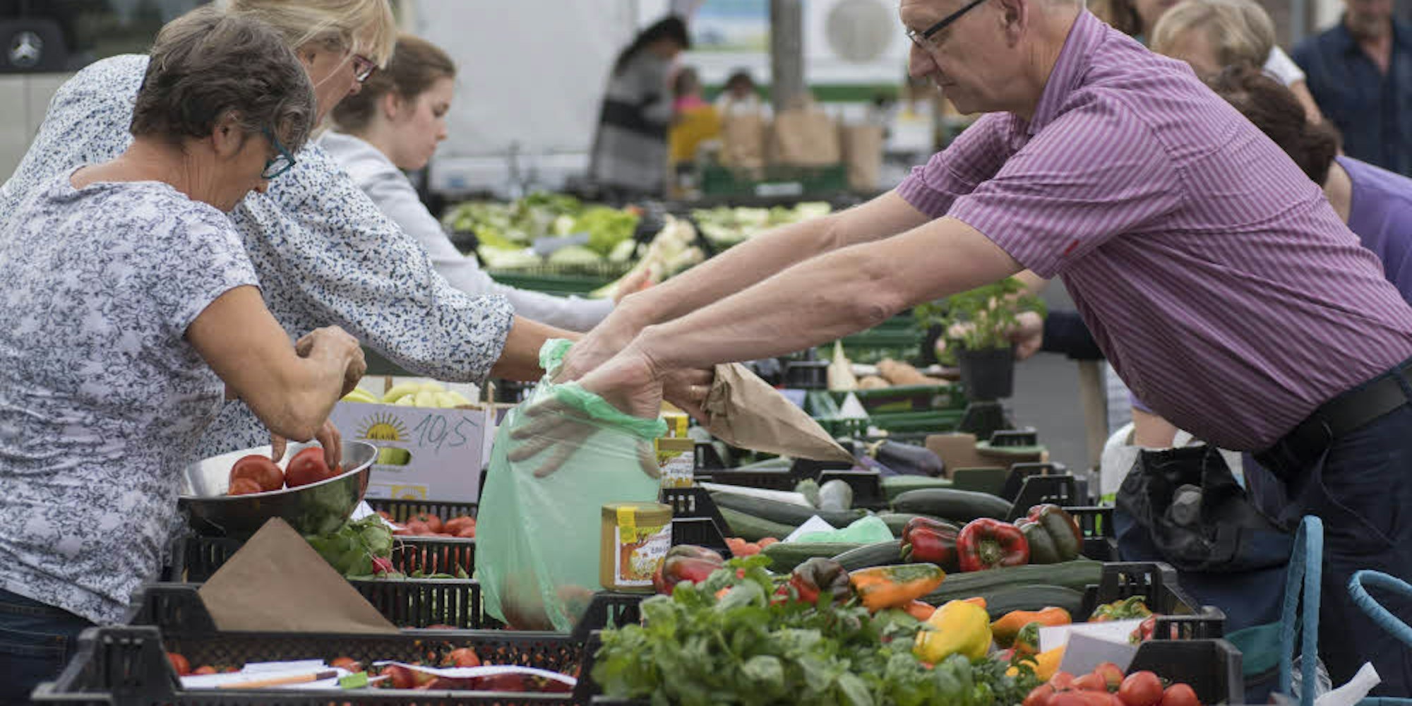 Am Obst- und Gemüsestand von Ludwig Mahlberg herrscht beim Wochenmarkt in Euskirchen ein reges Treiben.