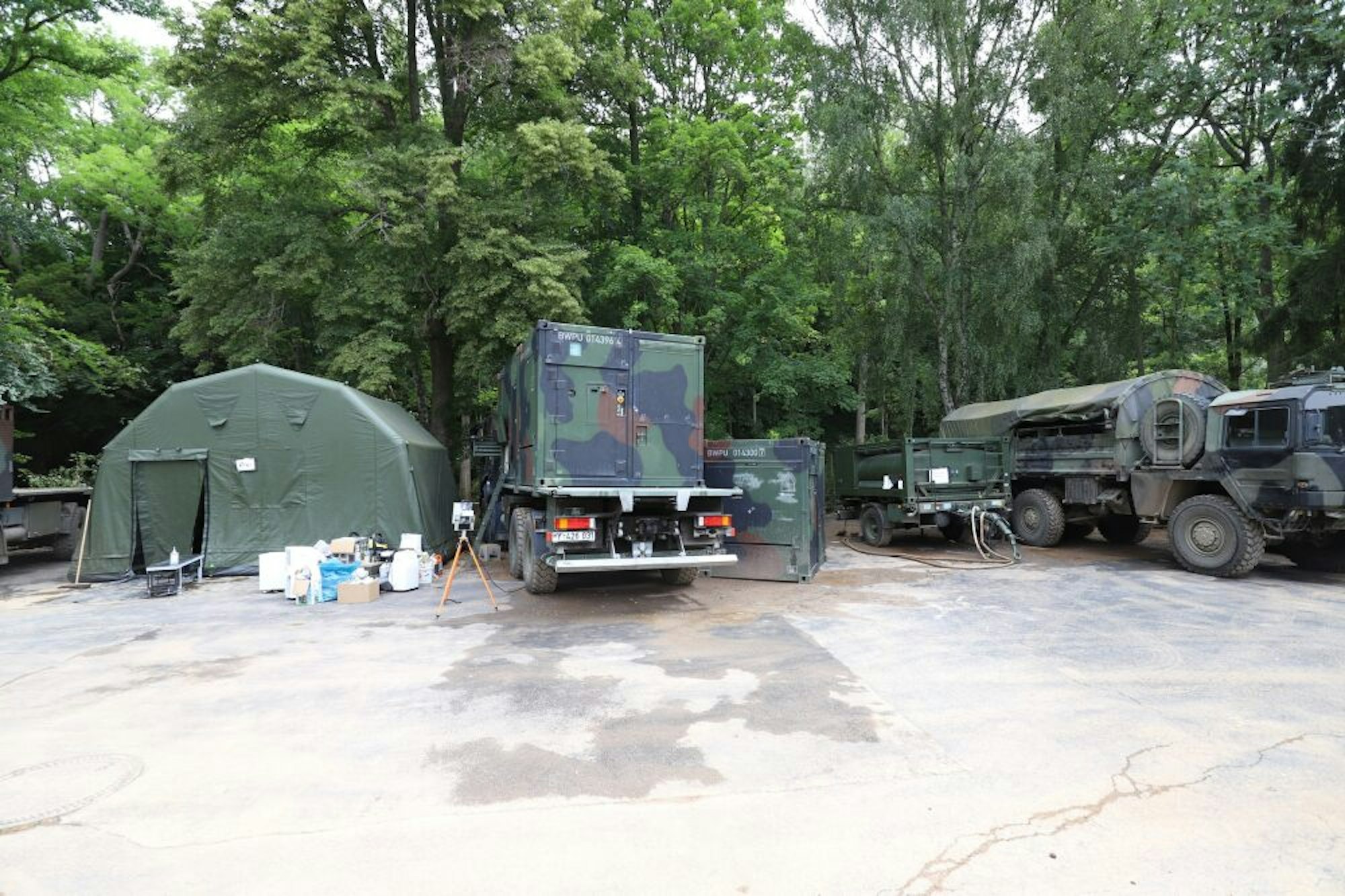 Nun beherrscht die Farbe Oliv das Bild: Zwei Duschzelte für die Bevölkerung hat das ABC-Abwehrbataillon 750 Baden aus Bruchsal hier aufgebaut. Auch eine Trinkwasserausgabe wurde installiert.