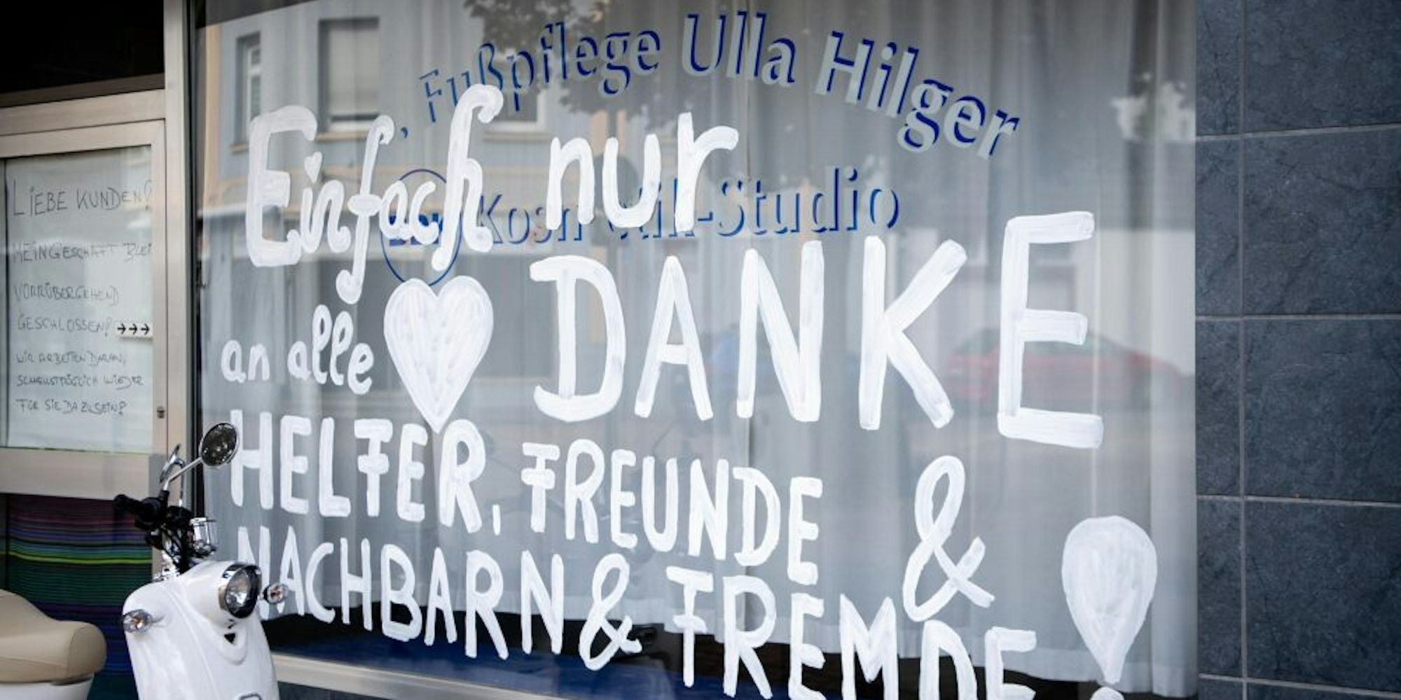 Dankesgrüße an die vielen Helfer finden sich an einigen Geschäften in der Euskirchener Innenstadt.