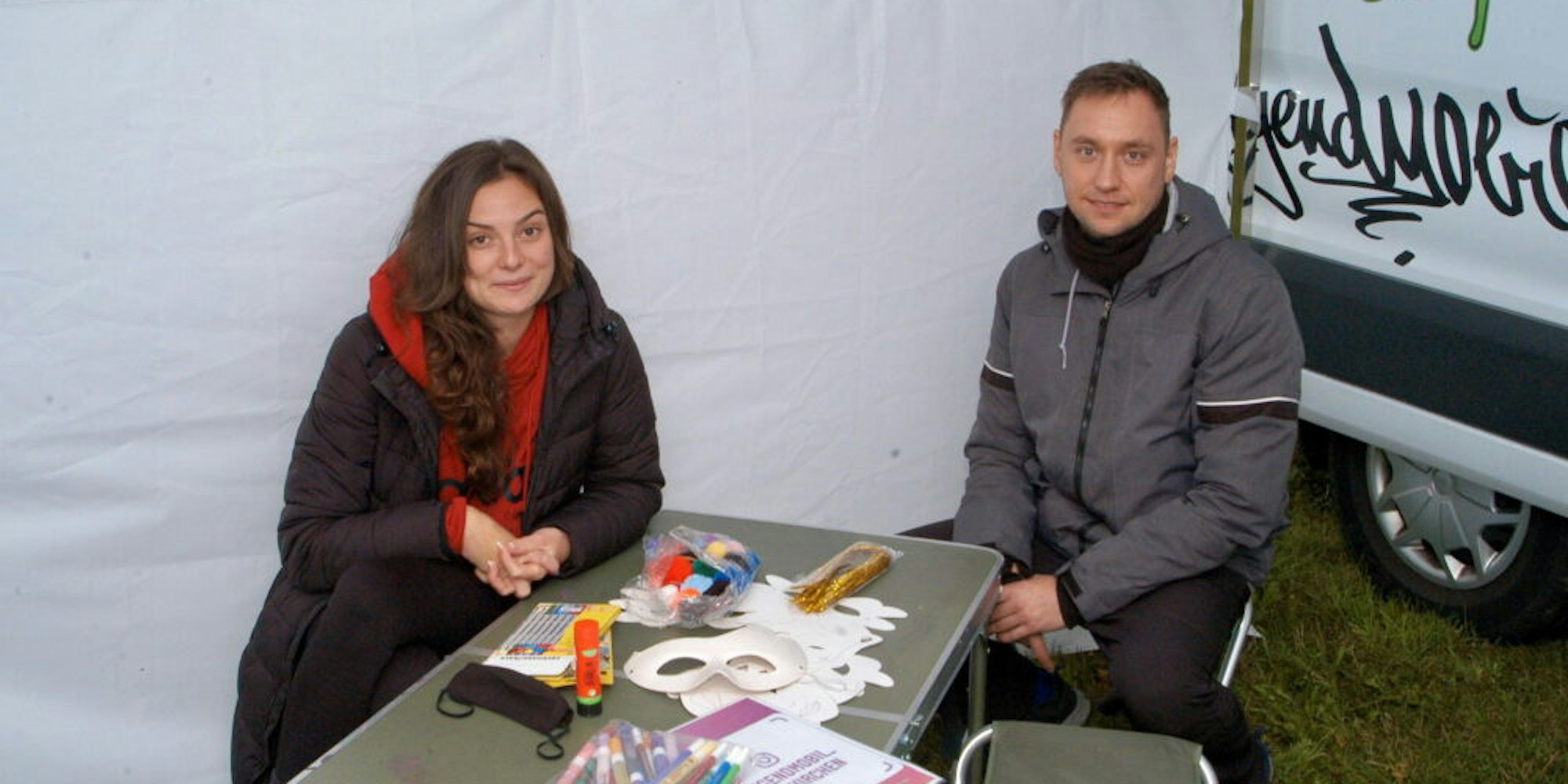 Euskirchen – Von Musik über Sport bis hin zu künstlerischen Projekten hat das Jugendmobil einiges für seine Besucher zu bieten. Der Ford Transit der Caritas mit Wojciech Hapka und Senobie Münch trotzt dabei der aktuellen Situation und ist an fünf Tagen die Woche mit jeweils zwei Stopps unterwegs.
