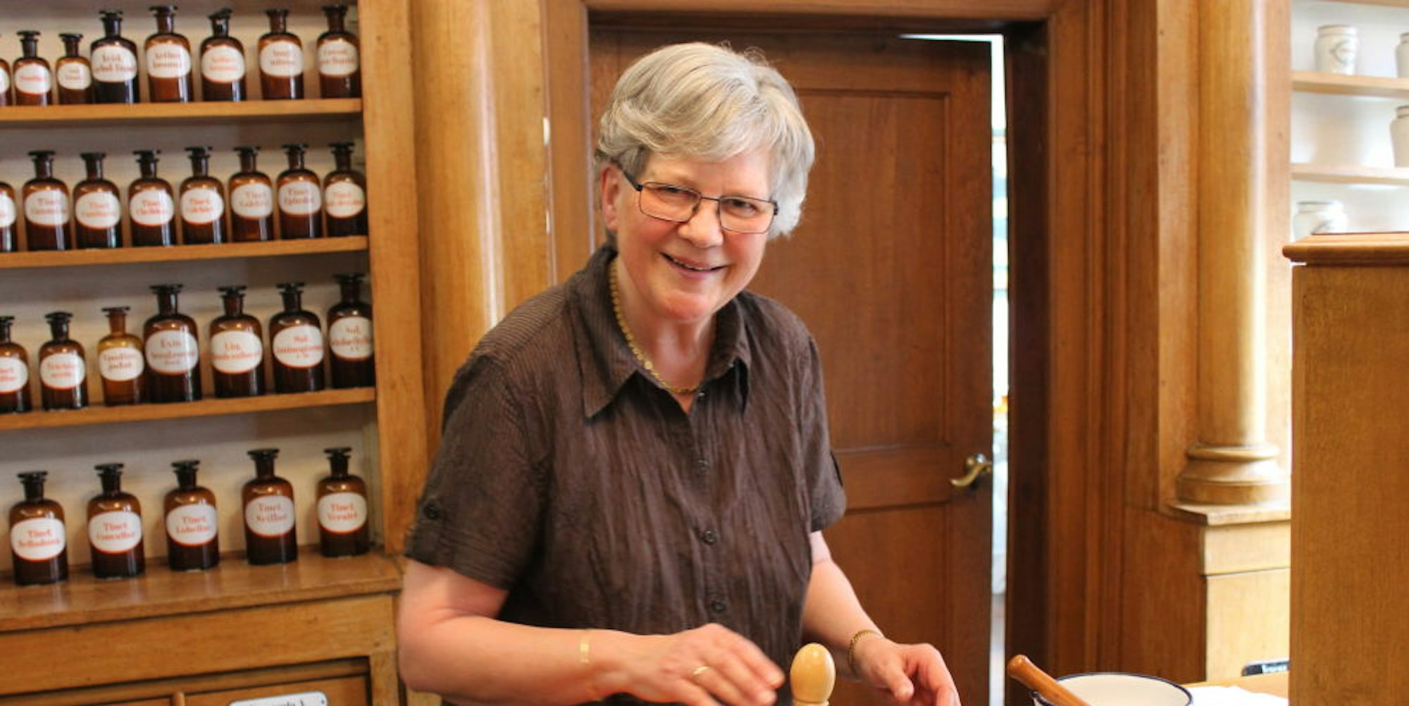 Gertrudis Symann und weitere Ehrenamtler des Arbeitskreises Schwanen-Apotheken-Museum führen die Besucher durch das Museum – vorbei an Hunderten Standgefäßen von vor 150 Jahren und den vielen Geräten, mit denen die Arzneien bis ins 20. Jahrhundert hergestellt wurden. Bei dem Rundgang beeindruckt die Apothekerin mit ihrem Wissen, sie kennt die Apotheke bis ins kleinste Detail. Kein Wunder, denn die Bad Münstereifelerin hat bis 1994 selbst dort gearbeitet. Symann und ihr Mann Theodor übernahmen 1974 gleich nach dem Pharmaziestudium die Apotheke von Symanns Tante Ina Bresgen. Die beiden waren die letzte Generation, die in der zweistöckigen Apotheke gearbeitet hat.