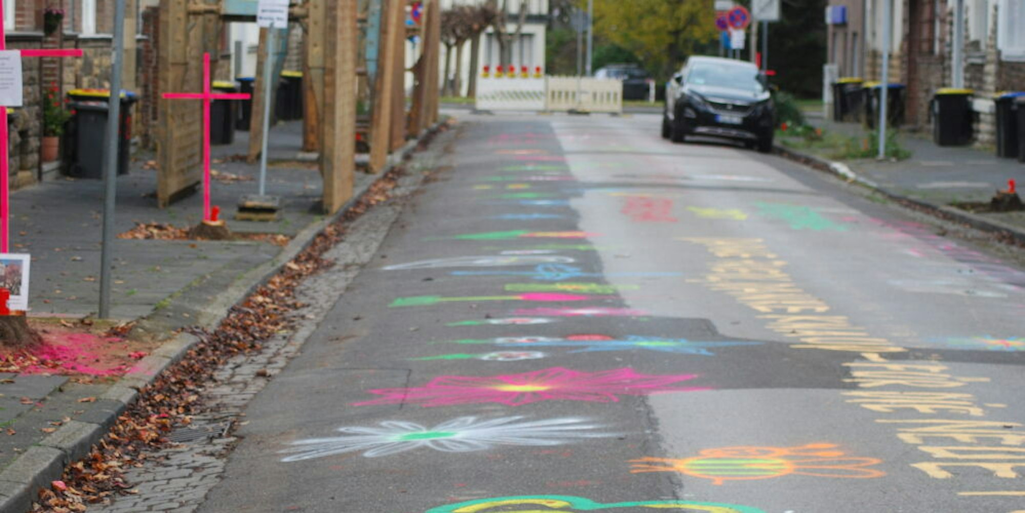 BI-Sprecher Dirk Dahlen distanzierte sich von den Parolen: „Damit hat die Bürgerinitiative nichts zu tun.“ Sie reagierte mit eigenen Aktionen: Auf den Baumstümpfen platzierte sie Grablichter, daneben jeweils ein Holzkreuz. Auf der Fahrbahn hinterließen die Bürger Malereien, hauptsächlich in Form von bunten Blumen, zudem den Satz „Wir liebten unsere Bäume“. All das war am Montagvormittag schon wieder verschwunden, nachdem die von der Stadt beauftragte Firma mit dem Abfräsen der Asphaltschicht die Tiefbauarbeiten einläutete.