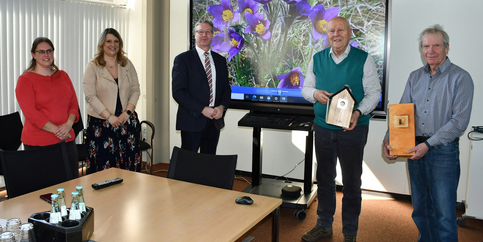 Neben der UNB werden auch die Biologische Station und die Kommunen ihre jeweilige Naturschutzgebietsdokumentation erhalten und an die Entwicklung der Schutzgebiete erinnert werden. Als Anerkennung und Dankeschön überreichte Achim Blindert stellvertretend für die UNB Wolfgang Schumacher einen Nistkasten, der in seinem privaten Garten einen Platz finden soll. (eb)