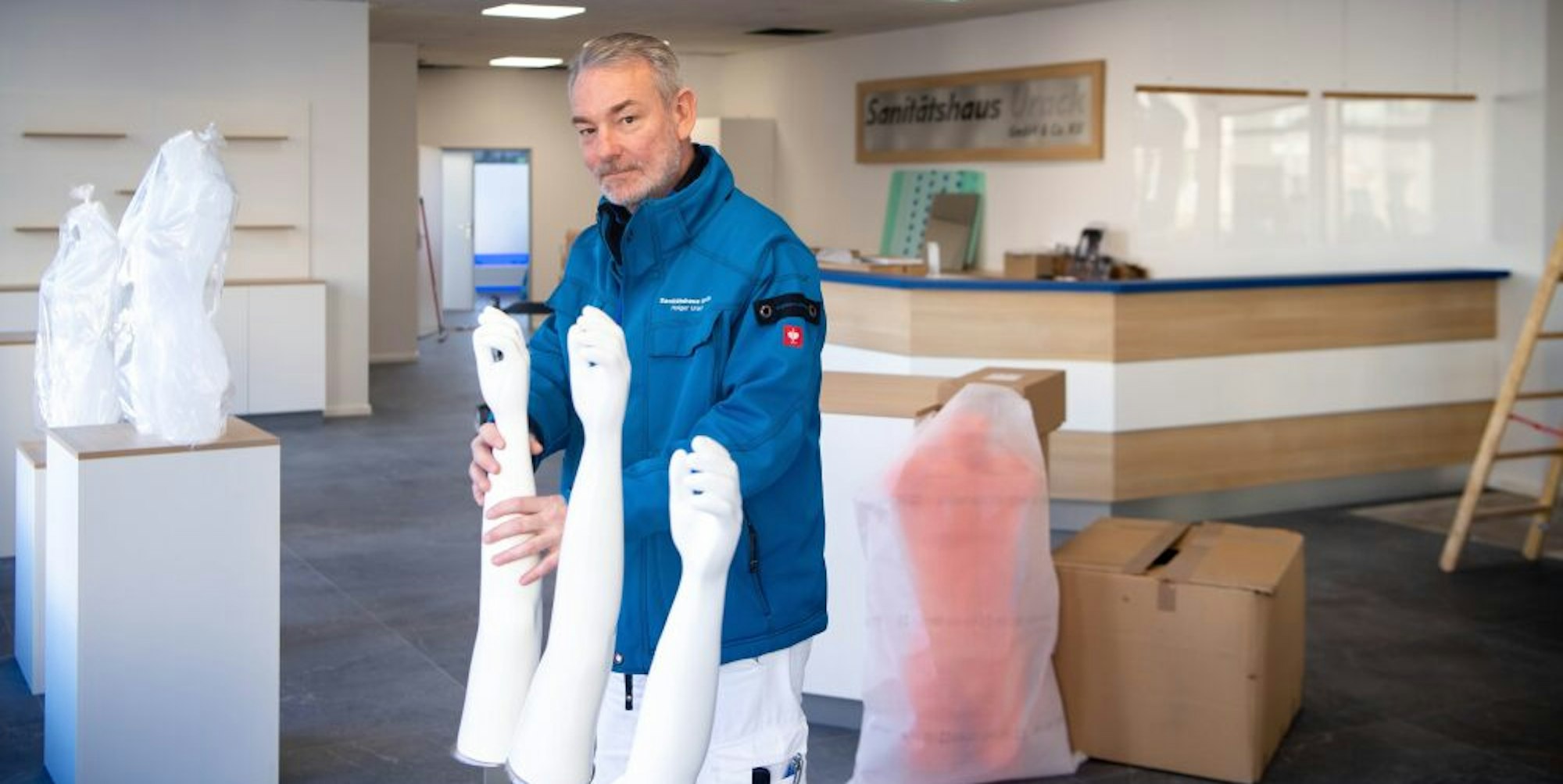 Am 3. Februar will Urack sein Sanitätshaus an neuer Stelle eröffnen. „Das Schöne ist, dass ich dort nicht nur den Laden, sondern auch direkt die Werkstatt habe“, so Urack. Da die bisherige Werkstatt an der Alten Gerberstraße durchs Wasser zerstört wurde, fertigt Urack die Prothesen aktuell in seiner Garage an. Seine Mitarbeiterinnen arbeiten die Aufträge aus Uracks Wohnzimmer ab. „Wir bauen Euskirchen wieder auf. Aufgeben war nie eine Option“, sagt Urack.