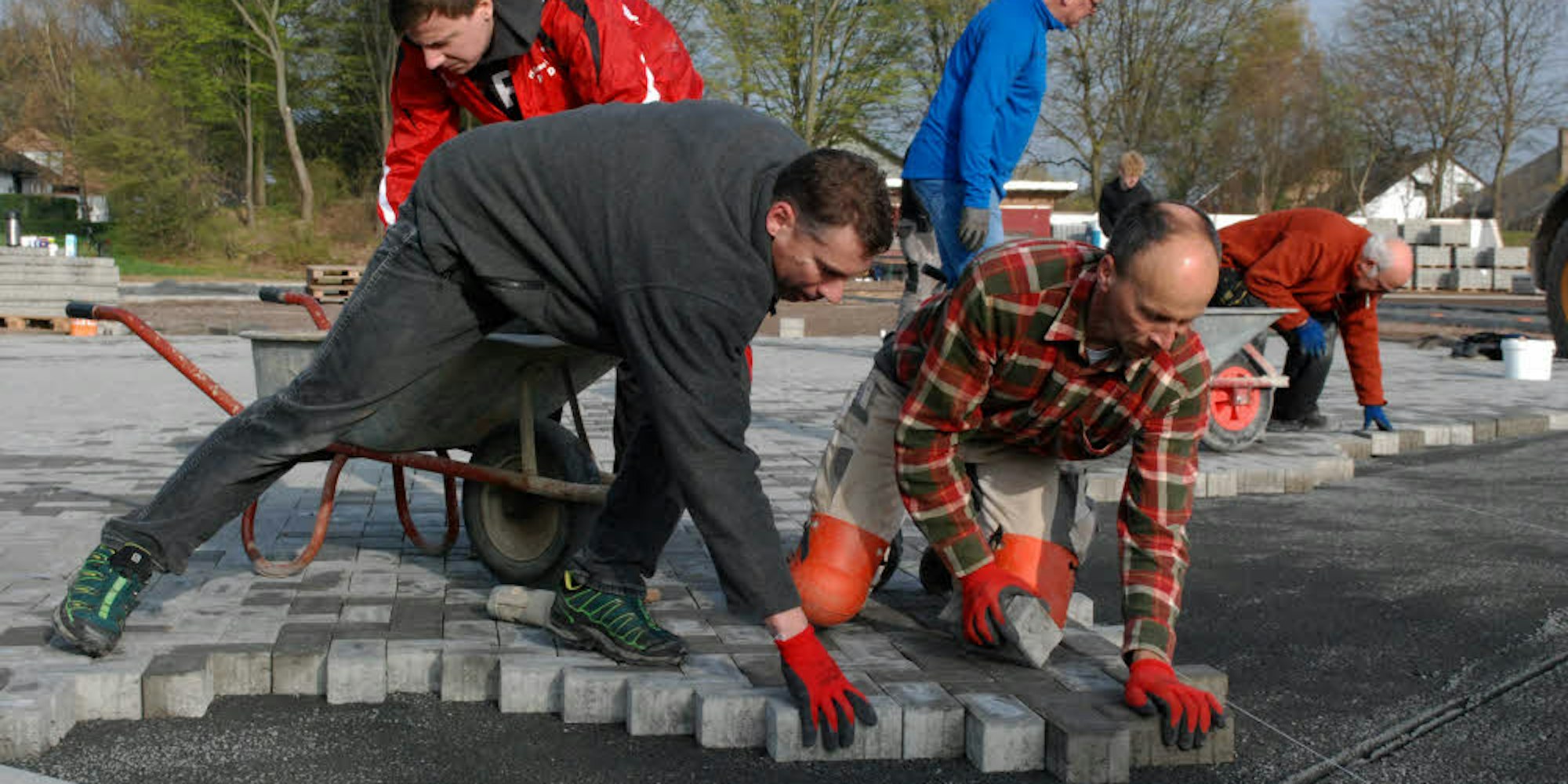 Stein für Stein harte Arbeit: 1000 Quadratmeter Pflastersteine verlegen die Mitglieder vom VfR Flamersheim und TuS Kreuzweingarten-Rheder am Flamersheimer Sportplatz.